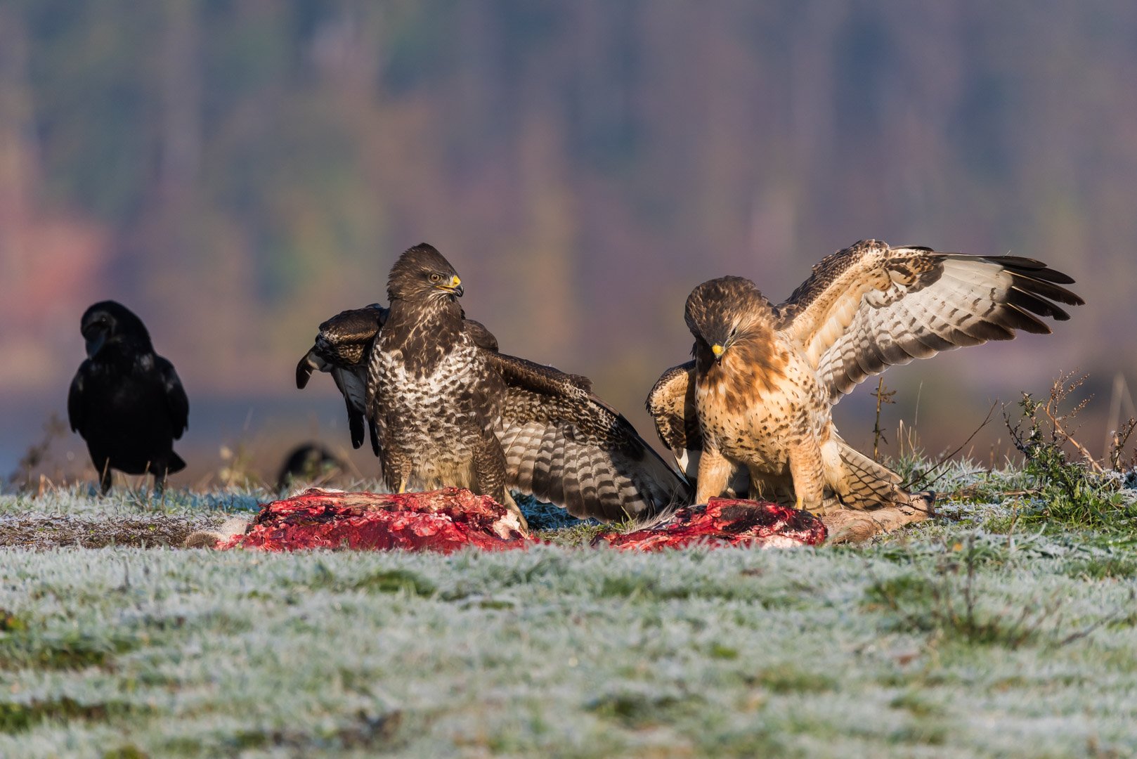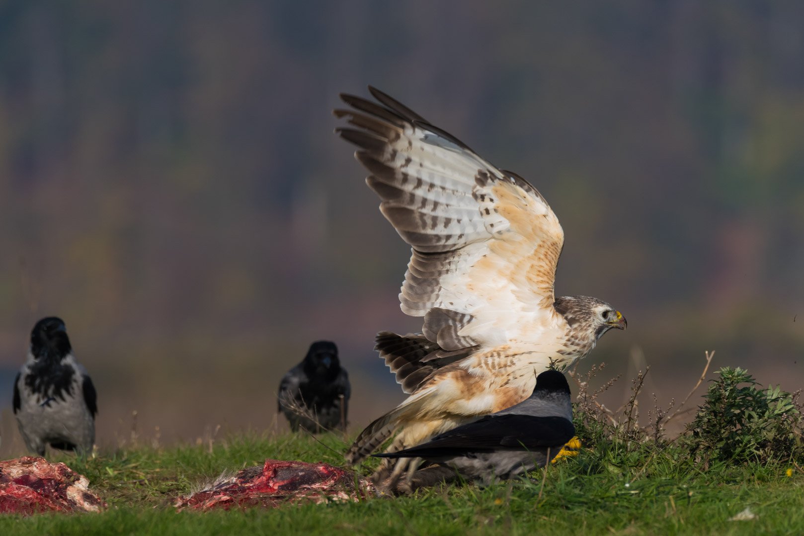 Eigentlich wollte ich bei Fred in der Feldberger Seenplatte Seeadler fotografieren. Aber nur ein misstrauischer Adler ließ sich sehen, aber nicht fotografieren. Dafür kamen aber viel Rabenvögel und Bussarde, um sich an dem halben Hirsch zu laben, der als Köder vor der Beobachtungshütte platziert war.