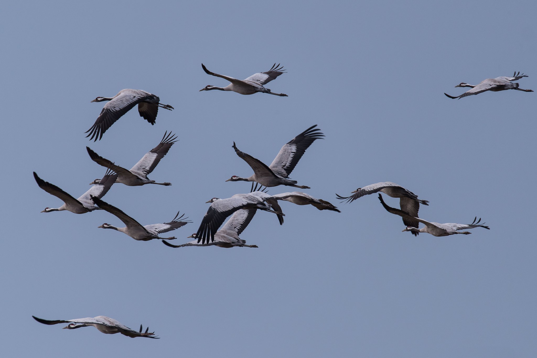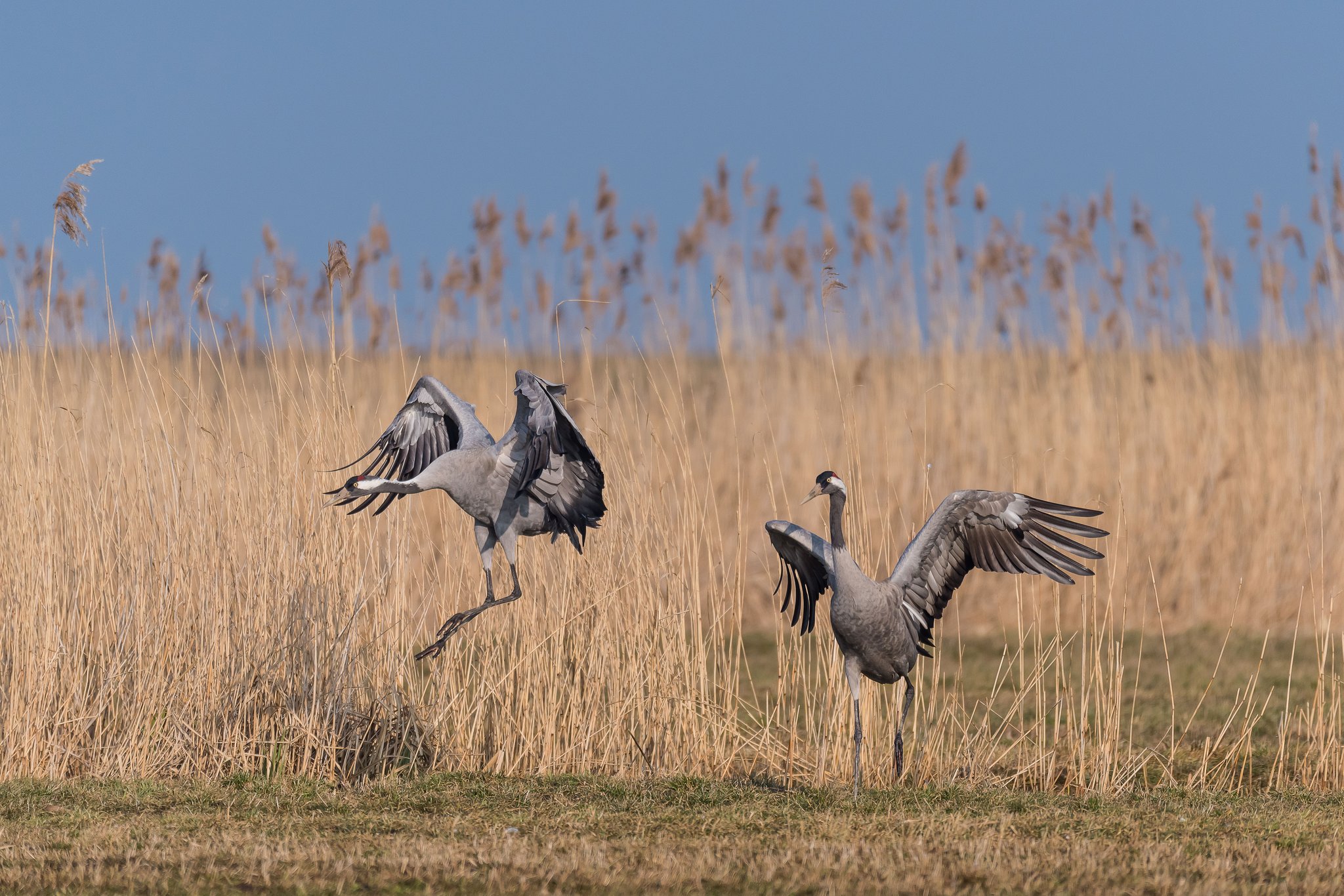 Kraniche gelten als Glücksvögel - und faszinierende Tiere sind sie ohnehin. Um ihnen auf ihrem Zug zu ihren Brutgebieten im Norden einmal so richtig nahe zu kommen, habe ich mich am vergangenen Wochenende in den Günzer Vogelwiesen an der Ostseeküste Mecklenburg-Vorpommerns in einer Fotohütte zwölf Stunden auf die Lauer gelegt. Leider haben sie mir kein Glück gebracht, denn in diesem kalten Frühjahr waren nur wenige Kraniche dort und die wenigen haben sich dann auch in nicht besonders fotogener Entfernung aufgehalten - so musste ich nehmen, was gerade kam...