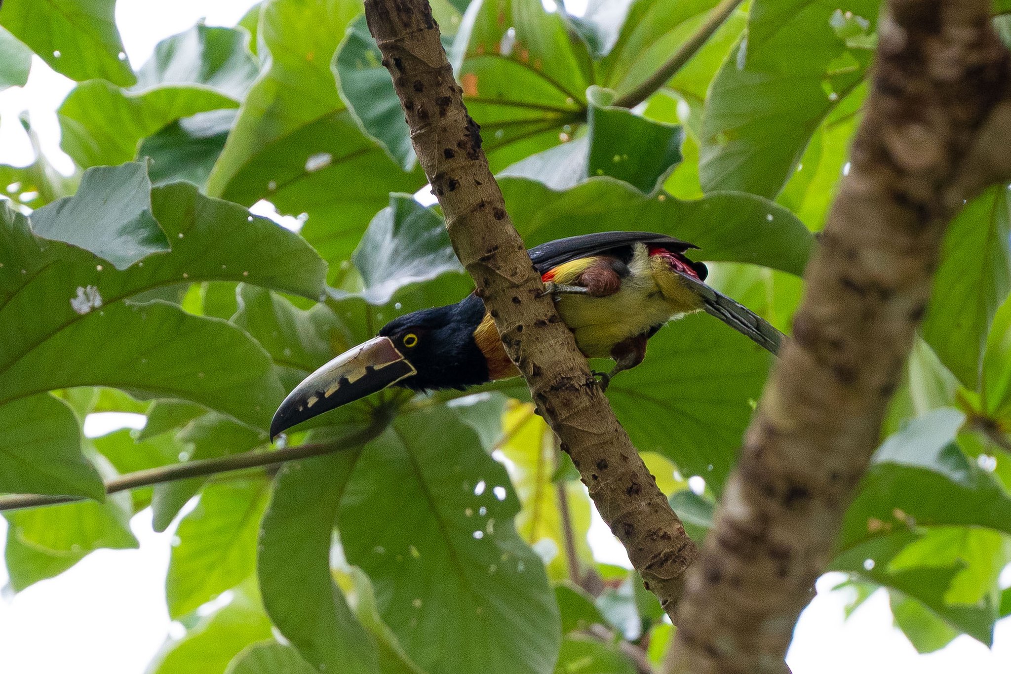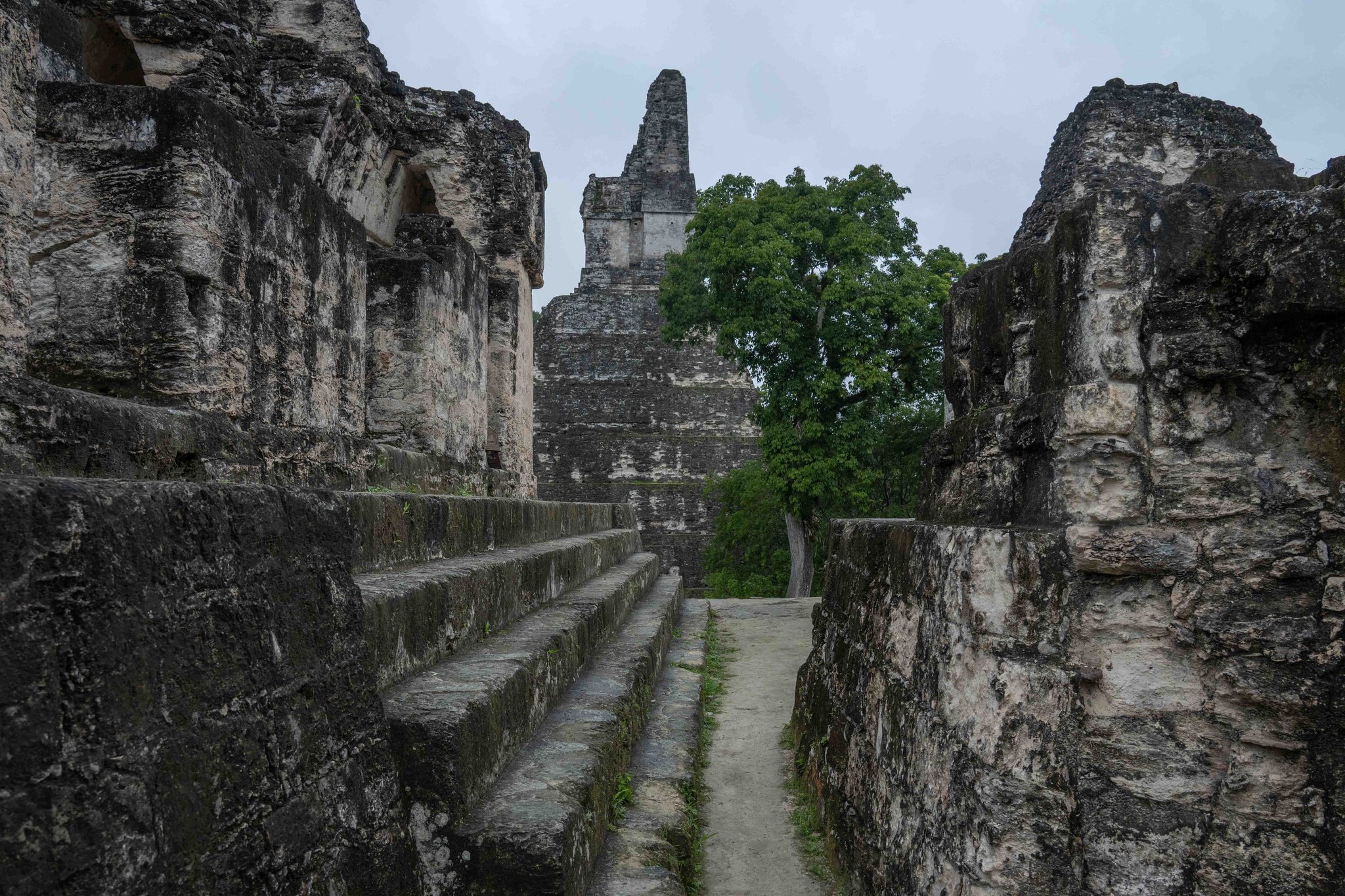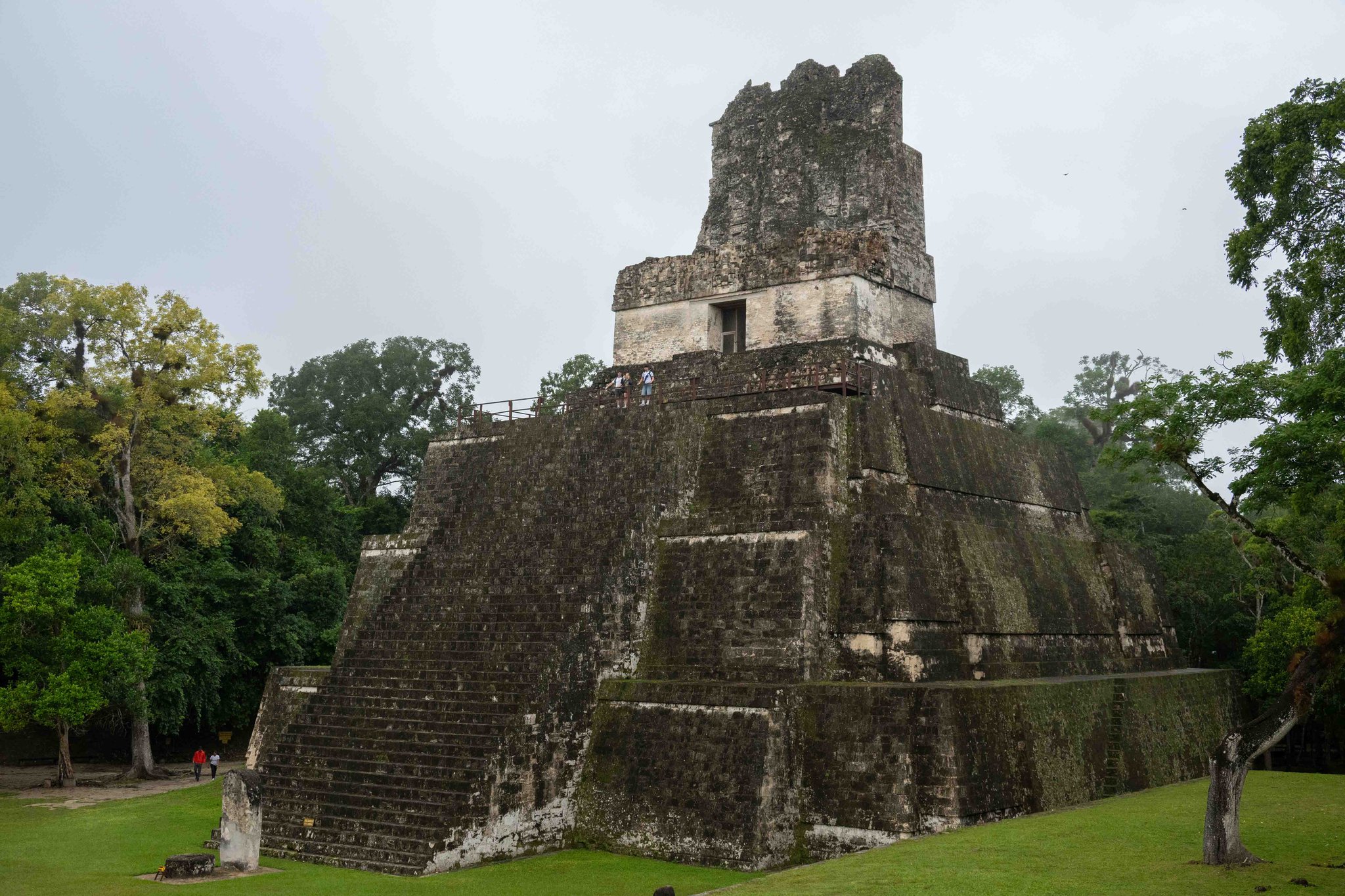 Für den ersten Weihnachtsfeiertag habe ich eine Tour nach Tikal gebucht. Die Sonnenaufgangstour. Start im Hotel um 03.00 Uhr. Für die Hoffnung auf einen Sonnenaufgang über dem Regenwald und die Stimmung des erwachenden Regenwaldes stehe ich um 02.40 Uhr auf. Das war eine sehr kurze Nacht, denn wie an allen erdenklichen Feiertagen, wird natürlich auch Weihnachten um Mitternacht ein Feuerwerk abgefackelt. Pünktlich um 03.00 Uhr werde ich von dem Tourguide abgeholt und mit einem Kleinbus geht’s in den 65km entfernten Nationalpark mit den Mayaruinen. Bei vollkommener Dunkelheit sind erst einmal zwei Zugangskontrollen zu passieren, eine für den Nationalpark und eine für die Ruinen, es folgt eine gut einen Kilometer lange Wanderung mit dem obligatorischen Guide durch den Dschungel mit dem Licht, das die Handyleuchten hergeben, denn nicht einmal der Guide hat eine richtige Lampe dabei. Über eine lange Holztreppe folgt der Aufstieg auf eine der Pyramiden der Anlage, wo bereits zahlreiche andere Touristen über dem Wald den Sonnenaufgang und den Blick über die Ruinen erwarten. Nach einer Stunde beginnt die Dämmerung, aber dichter Nebel und Nieselregen nehmen jede Sicht und die Sonne kann man nicht einmal erahnen. Was bleibt, sind die Rufe der Brüllaffen und Vögel irgendwo tief im Wald. Etwas frustriert beginnt der Abstieg. Das frühe Aufstehen und die 100 Quetzales extra für dieses Erlebnis hätte ich mir gern ersparen können. Immerhin ist der Führer mit der Geschichte des Ortes gut vertraut und es entgeht ihm auch kein Vogel oder Affe in den Bäumen bei dem Rundgang durch die Überreste der Stadt, die von den Maya bereits aufgegeben wurden, als Chichen Itzá entstand und auf ihrem Höhepunkt 150.000 Einwohner hatte. Mit einem Mal wird der Guide hektisch und treibt die Gruppe zur Eile an. Am Himmel ist etwas Blau zwischen den Wolken zu sehen, und es geht ein zweites Mal auf die Pyramide, und so gibt es doch noch den Blick auf die anderen Pyramiden und Tempel im Regenwald, der vielen aus einer Szene im ersten Starwars-Film vertraut ist und von einigen Besuchern akribisch für ein Foto nachgestellt wird.