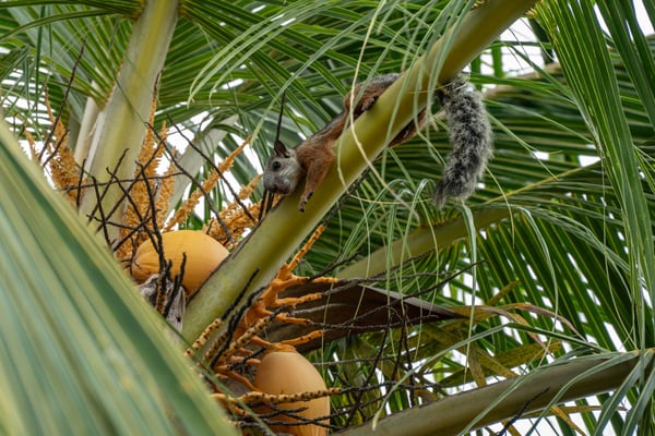 Seit San Salvador habe ich keinen Ruhetag mehr eingelegt und bin fast 900km ohne Pause gefahren. Die Beine signalisieren mir, dass sie dringend wieder einmal etwas anderes oder einfach nichts tun möchten, als den ganzen Tag in die Pedale zu treten. Der Ort hierfür ist Chacarita in der Nähe von Puntarenas. Bis hierher wurde Verkehr immer dichter und bedrohlicher bis hin zu einer Berührung mit einem Pkw, der beim Überholen komplett auf Seitenabstand verzichtete. Auf einem kleinen Campingplatz an der Küste schlage ich seit langer Zeit wieder einmal mein Zelt im Schatten der Palmen auf. Zelten bei diesen Temperaturen ist eine sehr schweißtreibende Angelegenheit und an einen erholsamen Schlaf ist nicht zu denken. Dass diese Platzwahl zudem nicht ganz ungefährlich ist, erfahre ich gleich am Morgen des nächsten Tages, als ich mich unter einen dieser Bäume setze. Plötzlich fängt es an zu tropfen, und da der Himmel wolkenlos ist, kann es kein Regen sein. Zwischen den Kokosnüssen sehe ich Bewegung und bei genauerem Hinsehen entdecke ich ein „Eich“-Hörnchen, das sich an einer Kokosnuss zu schaffen macht und für den Kokosmilchregen verantwortlich ist. Es sieht so aus, als wenn es das gesamte Innere der Kokosnuss auffrist – nur Anfänger begnügen sich mit Haselnüssen und Bucheckern. Mehrere der so ausgehölten Früchte liegen auf dem Rasen, es hätte mich also durchaus auch härter treffen können. Obwohl das nahe Puntarenas zumindest auf der Karte recht malerisch auf einer langgestreckten Landzunge liegt, ist es dort noch genauso trist, wie ich es von vor zwei Jahren in Erinnerung habe. Auch ein Kreuzfahrtschiff, dessen Passagiere den Ort fluten, ändert daran nichts.