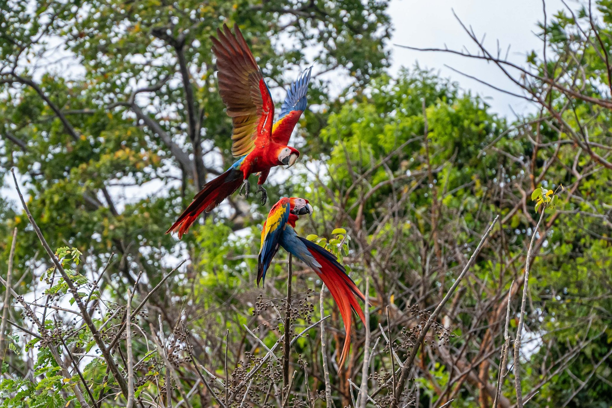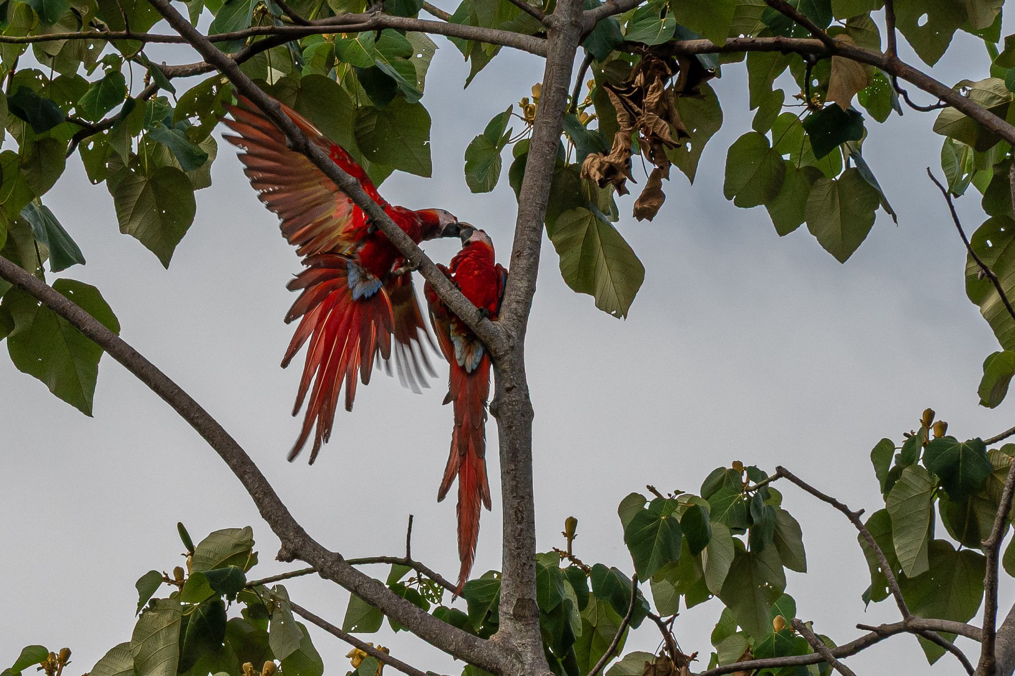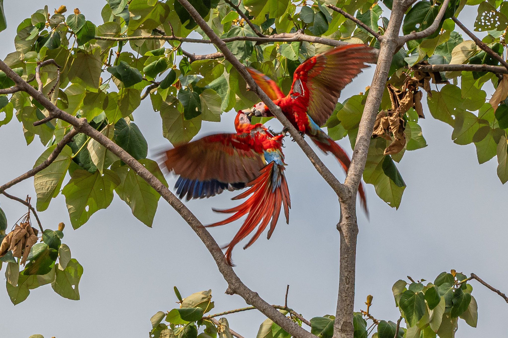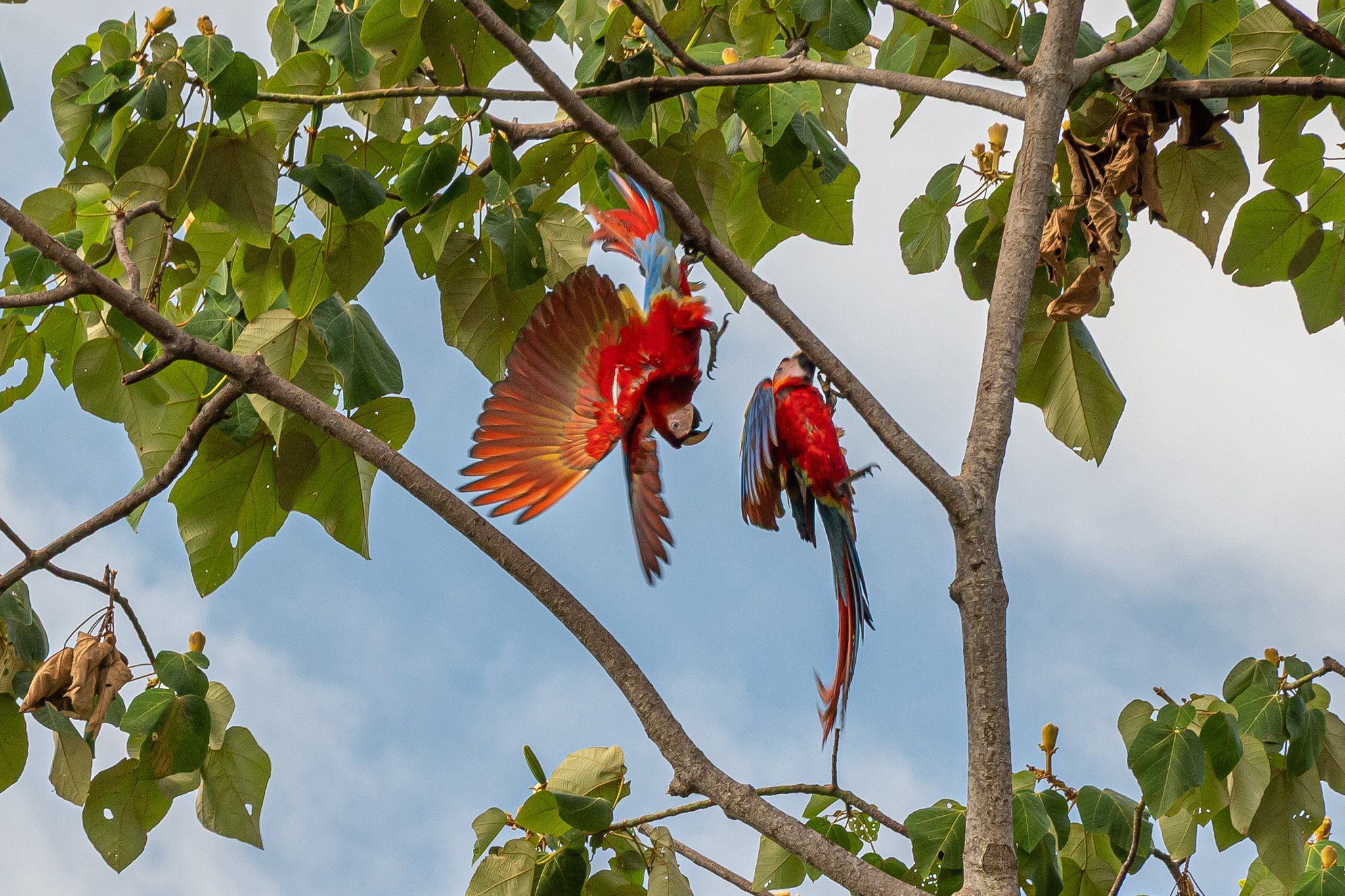 Das zweite Highlight macht sich durch lautes Geschrei hoch über mir bemerkbar. Eine kleine Ara-Schar hält sich dort auf und drängt sich als Fotomotiv geradezu auf.