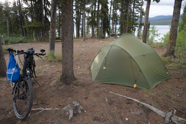 Wieder gemeinsam fahren wir Richtung Haines Junction. In der Nähe dieser kleinen Ortschaft hat Martin über Warm Showers eine Unterkunft organisiert. Aber statt durchzufahren, entschließen wir uns spontan an einem traumhaften Platz am Sulfur Lake unser Lager aufzuschlagen – einschließlich Bad im See und nächtlichem Besuch eines Elchs (den ich leider verschlafen habe – aber Videobeweis durch Martin).