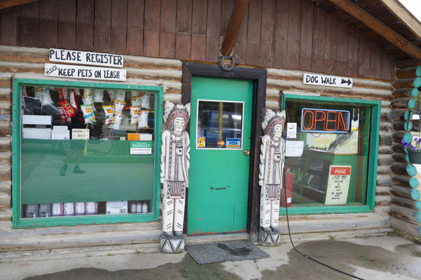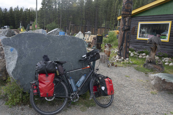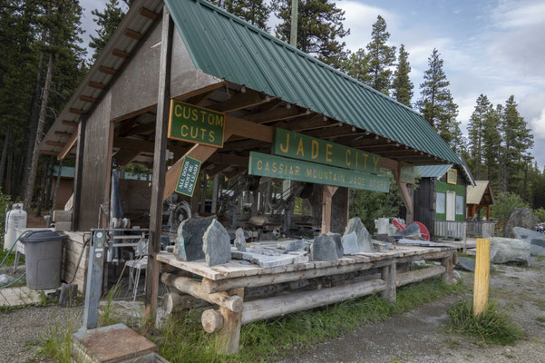 Am Ende der ersten Etappe auf dem Cassiar Highway erreiche ich Jade City. Keine Stadt, sondern nur ein Jadesteinbruch mit einem Souveniershop (alles Jade). Immerhin gibt es hier einen kostenlosen Kaffee und Internetzugang, ein paar Snacks, die Möglichkeit frei zu zelten und die Wasservorräte aufzufüllen. Die nächste Station auf dem Weg nach Süden ist Dease Lake, ein richtiger Ort, wo ich auch noch einmal meine Vorräte ergänzen kann. Man kann hier sogar Essen gehen – an zwei Schnellimbissständen im Ort, von denen eine ausverkauft ist und der andere eine Wartezeit von einer Stunde für einen Burger hat – so viel zu Fastfood. Nach der Übernachtung in einem RV Park, der eigentlich keine Zeltplätze anbietet, geht es wieder auf den Highway.