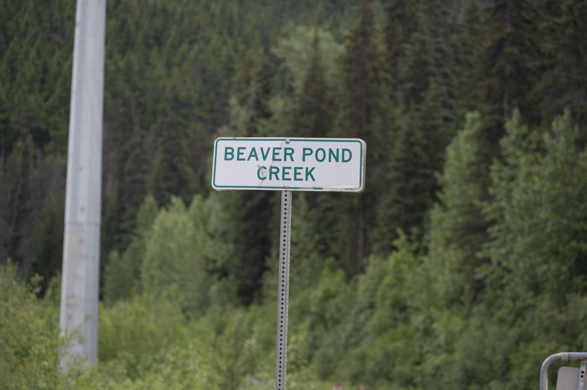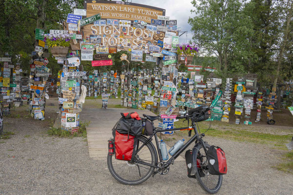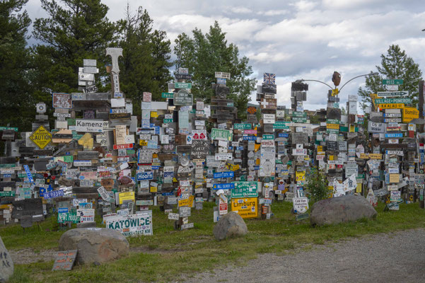 Nach sechs Tagen und zum Teil lausig kalten Temperaturen und viel Gegenwind erreiche ich Watson Lake. Bis hierher muss ich eigentlich nicht, weil ich 20km vorher auf den Cassiar Highway abbiegen will, allerdings gibt es auf diesem Highway auf 750km kaum Versorgungsmöglichkeiten und deswegen muss ich in Watson Lake erst einmal meine Vorräte auffüllen. Watson Lake ist der Ort mit dem weltberühmten Sign Post Forest – mehr als 80.000 Schilder aus aller Welt sind hier von Reisenden hinterlassen worden, auch sehr viele aus Deutschland, und ich weiß bis heute nicht, wo man bei uns Ortstafeln kaufen kann, um sie nach Kanada mitzunehmen! Angefangen hat das ganze übrigens mit einem amerikanischen Soldaten, der beim Bau des Highways im 2. Weltkrieg aus lauter Heimweh ein Schild aus seiner Heimat an einen Pfahl gehängt hat. Einkaufen, essen, ein paar schnelle Fotos vom Schilderwald und dann zurück zur Einmündung des Cassiar Highway, um dort auf einem stillgelegten Campingplatz zu übernachten.