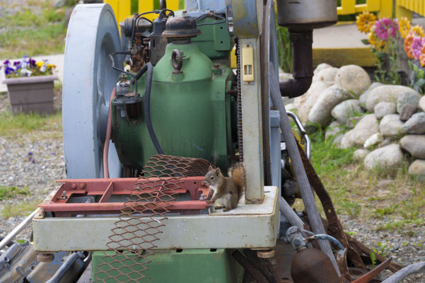Ein exklusiver Fahrradständer aus massiver Jade, Jadebruch zum mitnehmen und ein Eichhörnchen auf der Waage, das sein Gewicht offenbar deutlich überschätzt - Jade City, irgendwo am Cassiar Highway