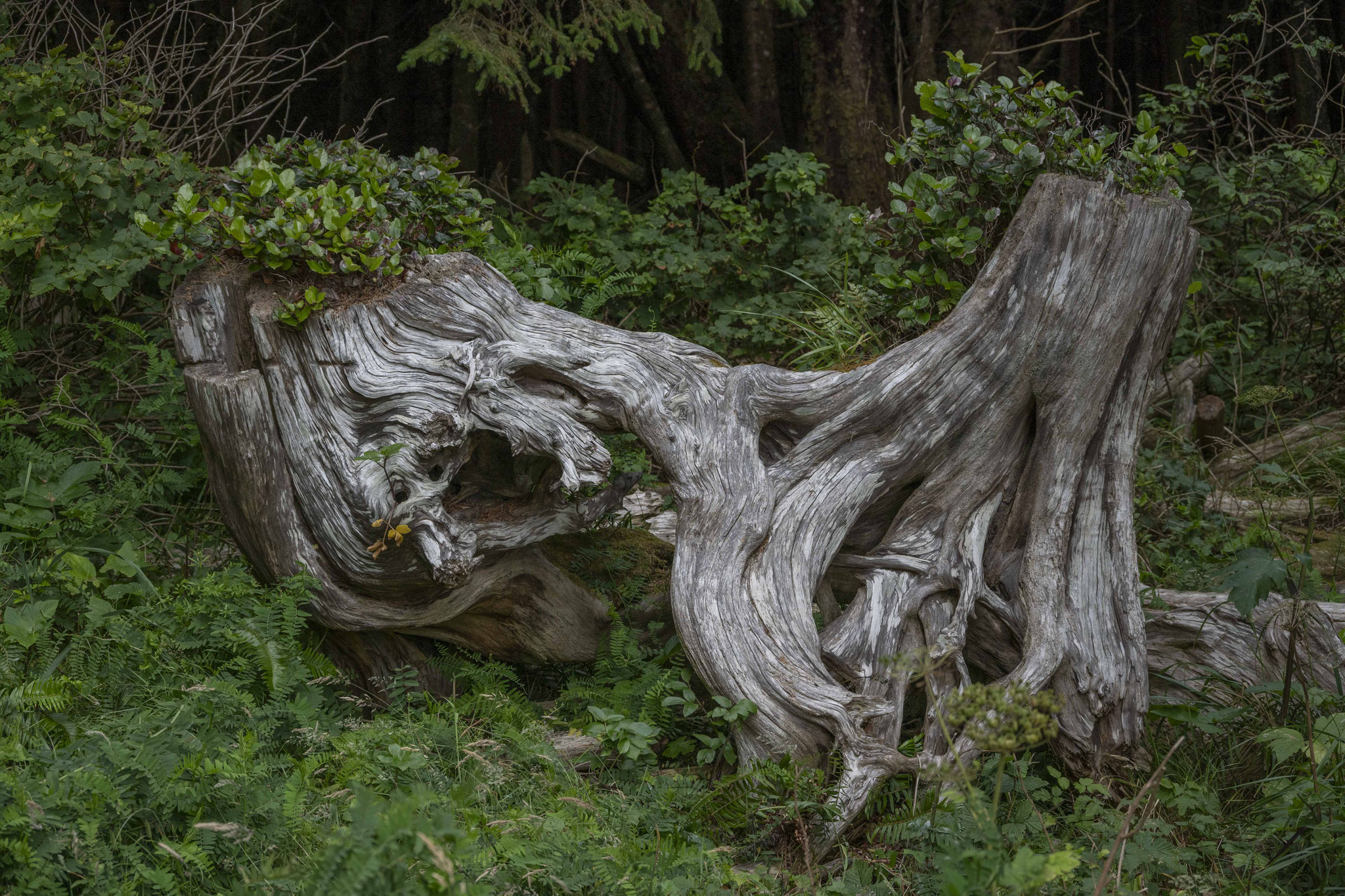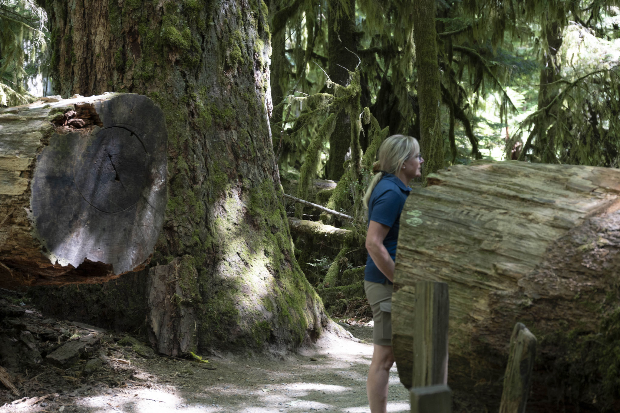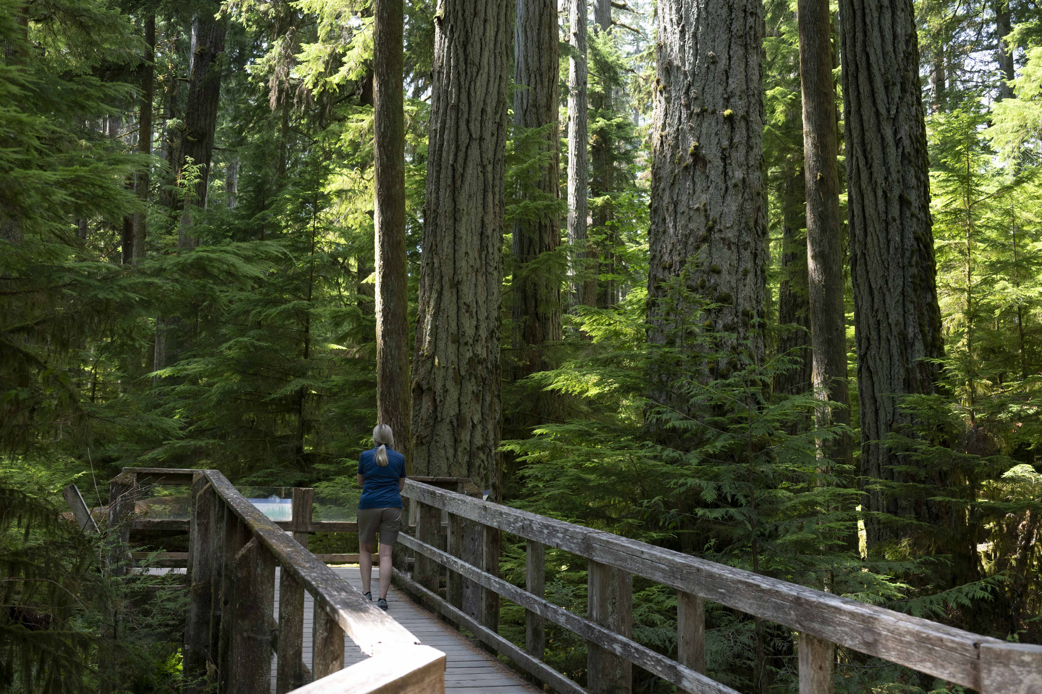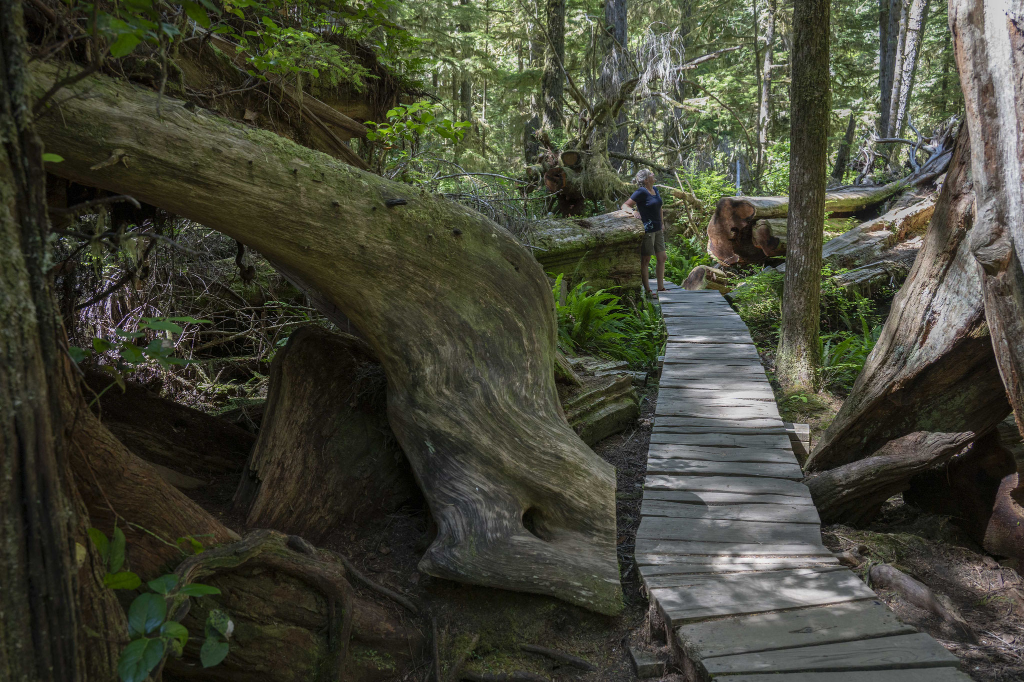 In Bamfield geht es entweder nur mit der Fähre weiter, oder man muss über Port Alberni zurück an die Ostküste der Insel. Auf dem Weg dorthin kommt man durch die Cathedral Grove, einem geschützten Waldstück, der zu den weniger als vier Prozent Primärwald auf Vancouver Island gehört, der nicht unter die Säge der Forstindustrie (über deren Dimensionen ich ja schon berichtete) gekommen ist. 400 – 800 Jahre alte Douglasien und Rotzedern lassen einen ehrfürchtig nach oben blicken und man bekommt einen kleinen Eindruck davon, wie die Wälder hier ausgesehen haben müssen, bevor vor ca. 150 Jahren Europäer anfingen, Axt und Säge an diese Giganten zu legen, bis fast keine mehr übrig waren und heute nur noch Kleinholz gefällt und verarbeitet werden kann (das immer noch beeindruckend genug ist). Wo es noch große und wertvolle Stämme in entlegenen Bergregionen gibt, werden diese z. T. bis heute gefällt und mit Hubschraubern herausgeholt (Helilogging) – unbegreiflich!