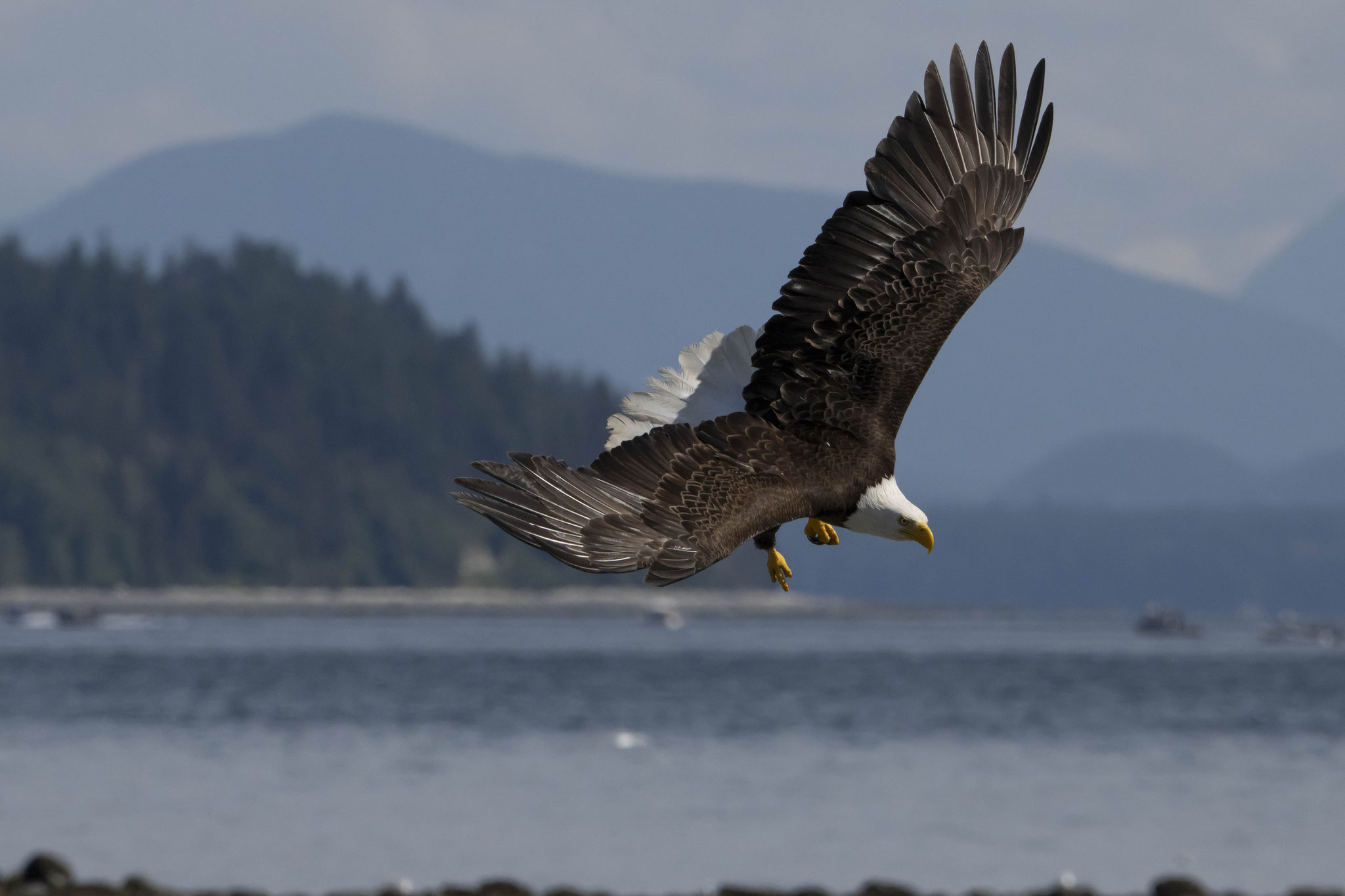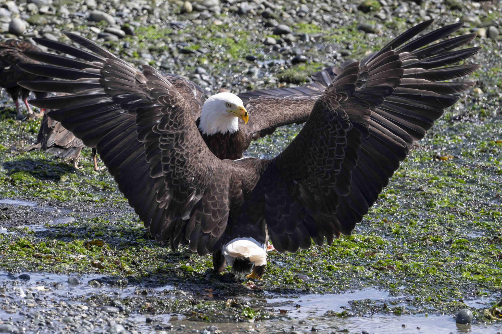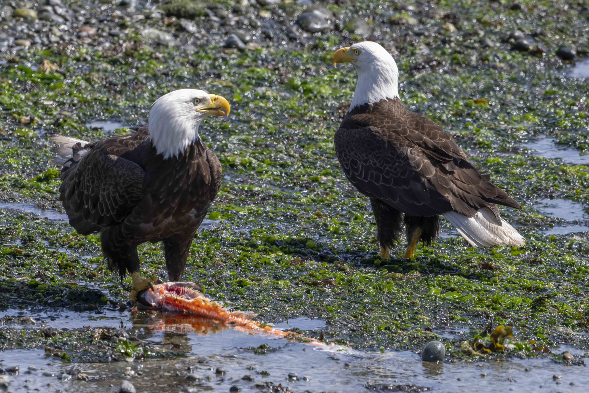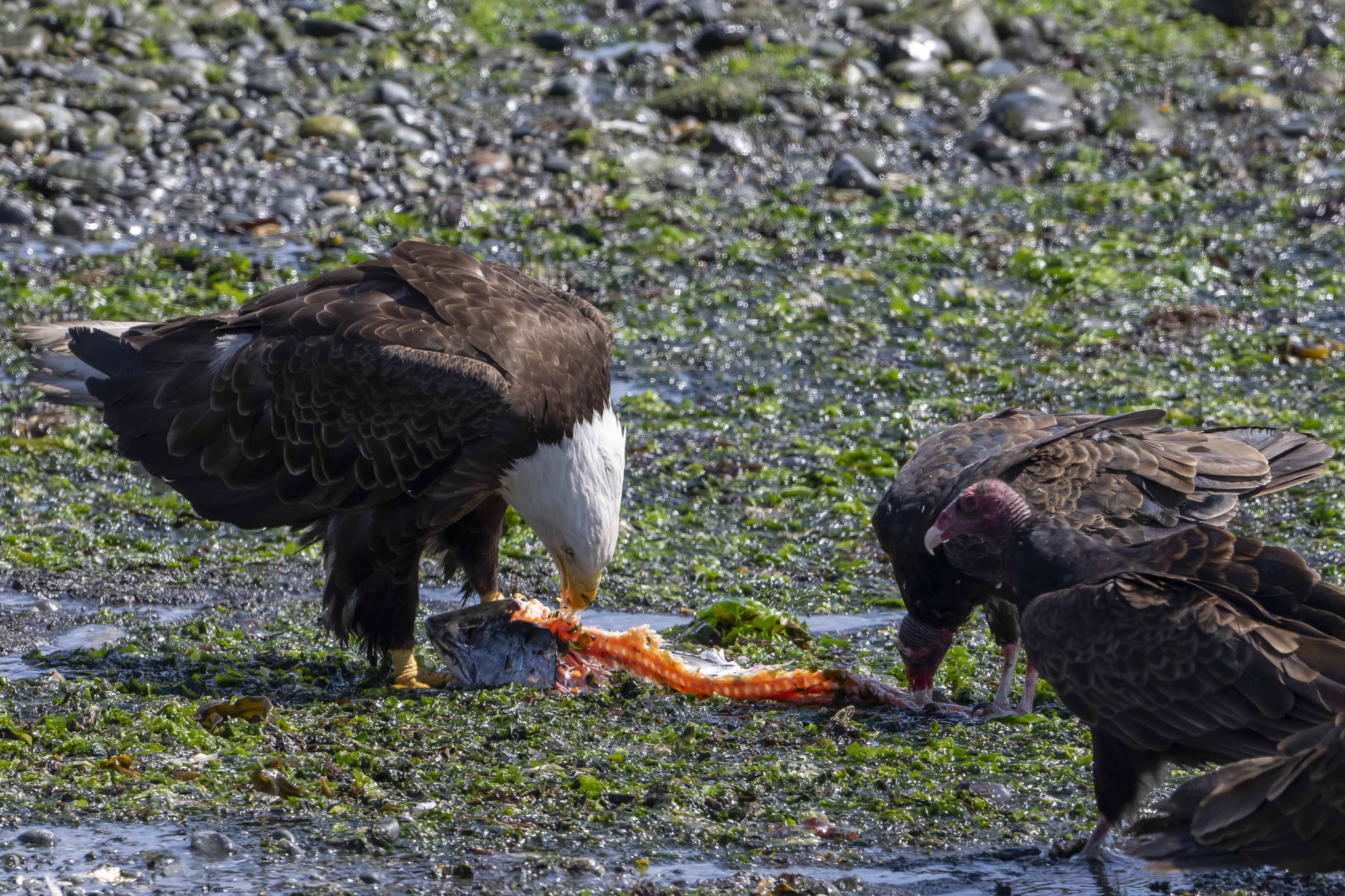 Zurück an der Ostküste bietet sich uns am Ortseingang von Campbell River ein ganz besonders Schauspiel. An einem Bootsslip haben Angler die Überreste von ausgenommenen und filierten Lachsen am Ufer zurückgelassen. Ein Fest für mindestens sechs Weißkopfseeadler und zahlreiche Geier und Möwen. Aus nächster Nähe werden wir Zeugen, wie die Hackordnung unter den Vögeln ist – Alder, Geier, Möwe, andere – und die Kamera läuft heiß. Nach einer Wanderung zu den Elk Falls, wo es neben dem Wasserfall auch noch einige Baumriesen zu bestaunen gibt, checken wir in einem B&B der besonderen Art ein, dem Haig-Brown-Heritage-House B&B, das Teil des örtlichen Museums ist und wo zwei Gästezimmer vermietet werden – und vieles mit der Einrichtung und in dem Ambiente des ehemaligen Bewohners, eines kanadischen Schriftstellers und Naturschützers, der bis zu seinem Tod im Jahr 1976 hier lebte.