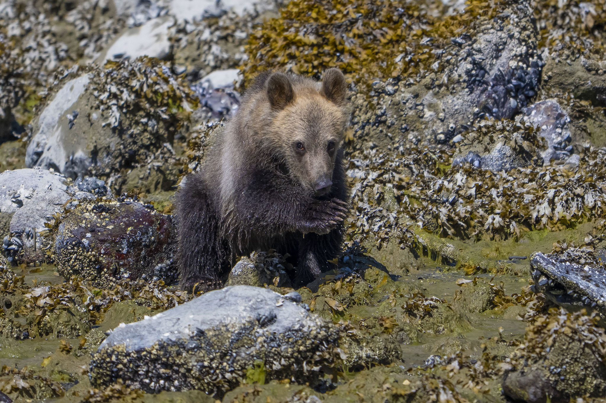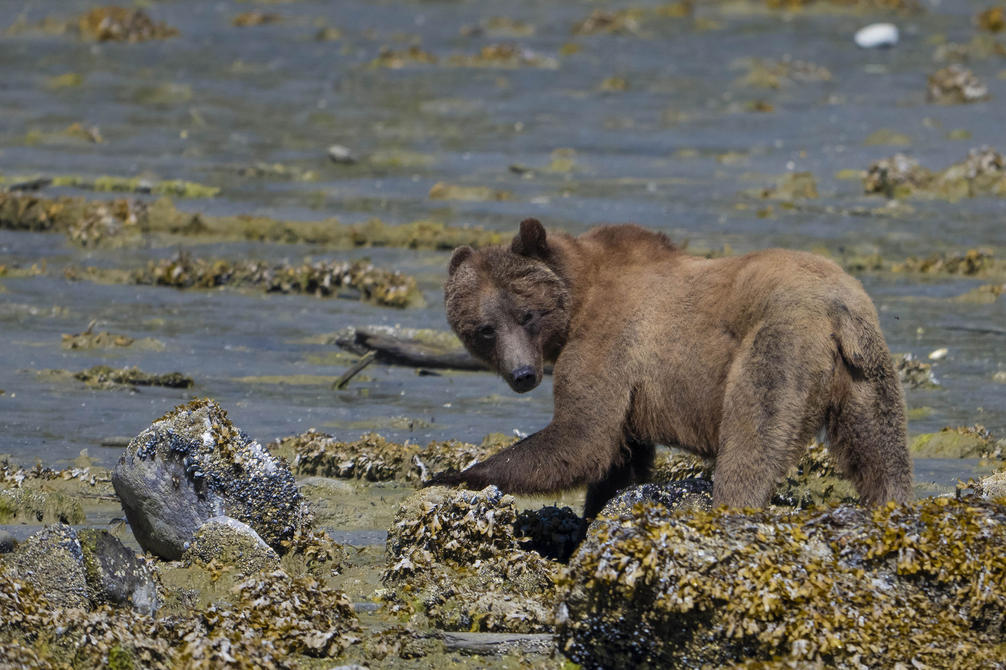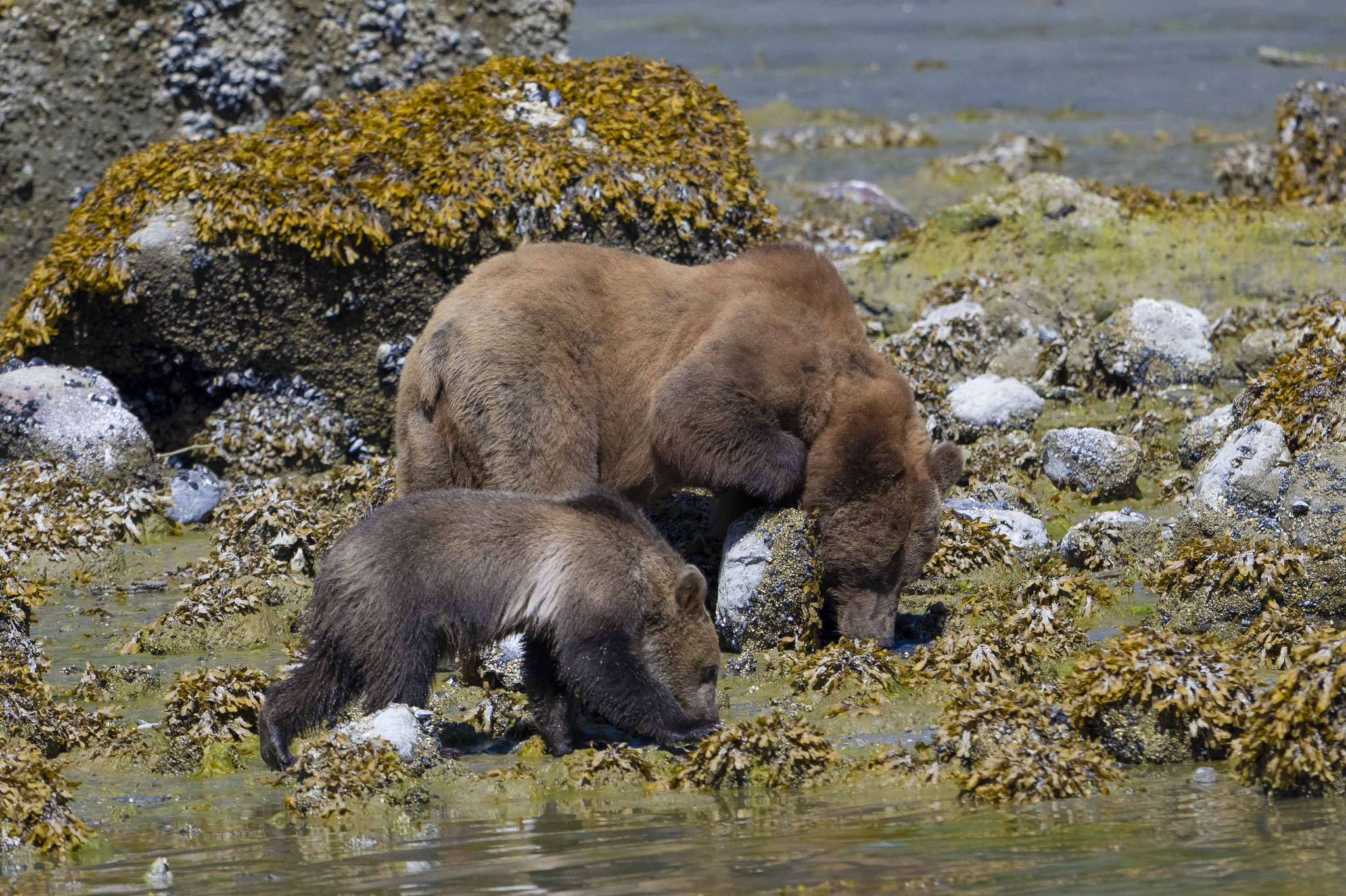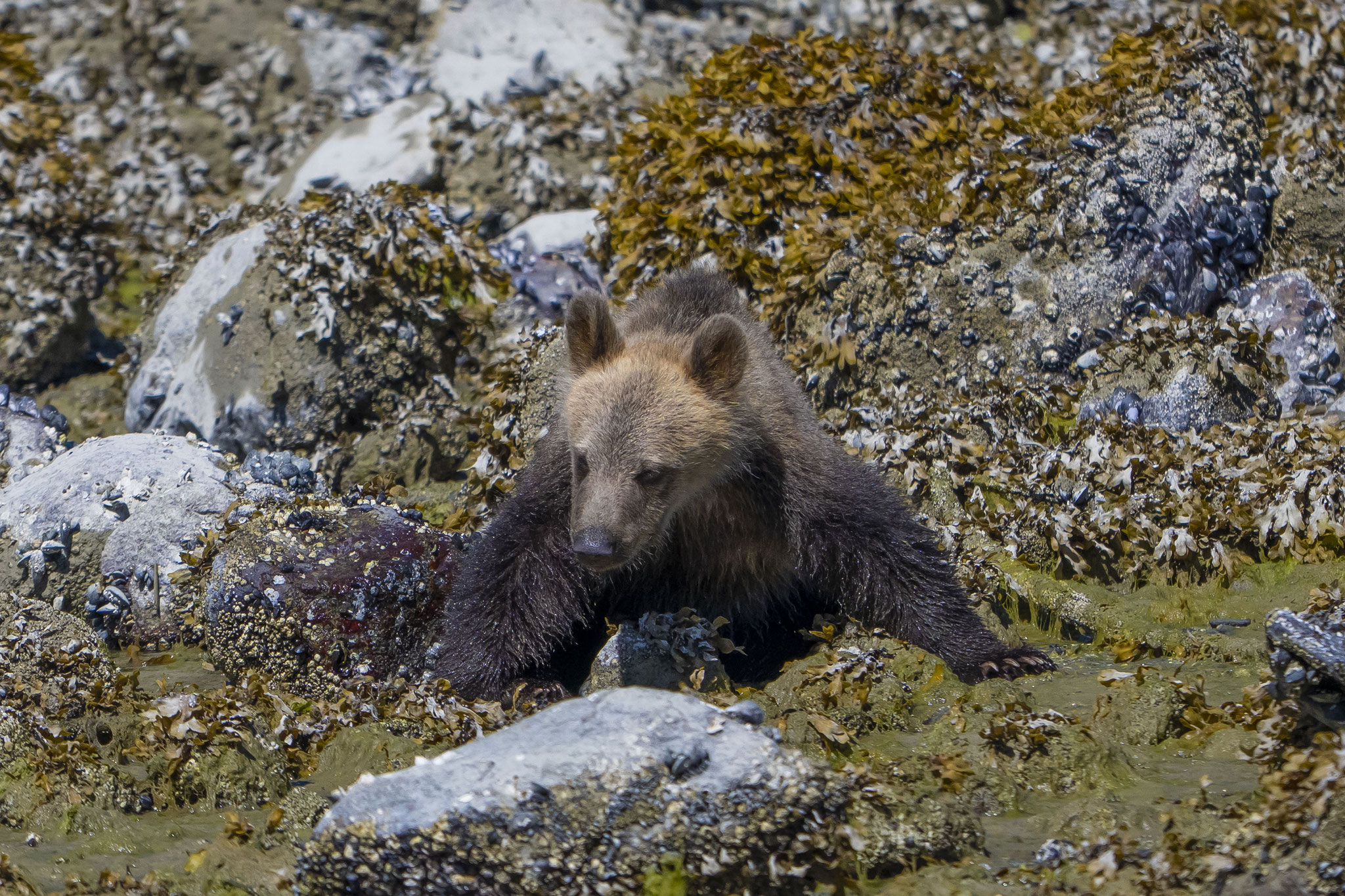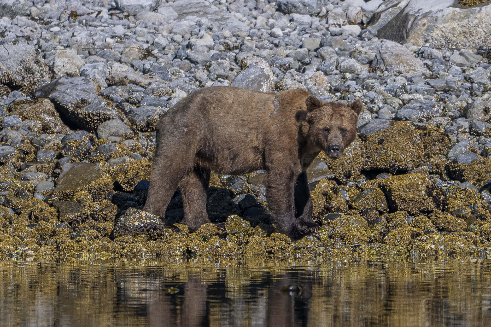 Die letzte Station im Norden der Insel ist Telegraph Cove, ein kleiner Ort um einen geschützten Naturhafen gebaut mit kleinen Häusern auf einem Holzsteg um die halbe Bucht. Leider ist die Hälfte der Häuser im Winter mit dem Steg durch ein Feuer vernichtet worden und gleichzeitig der Charme des Ortes, auch wenn man jetzt dabei ist, alles wieder originalgetreu zu rekonstruieren. Hier entschließen wir uns spontan, für einen üppigen Preis eine Grizzlytour mitzumachen. Start morgens um 06.30 Uhr, Dauer acht bis neun Stunden, wobei die meiste Zeit für die Fahrt in die Insel- und Fjordwelt zwischen Vancouver Island und dem Festland draufgeht. Mit der Ebbe erreichen wir unser Zielgebiet gegen Mittag und haben das Glück, aus der Nähe, aber in der Sicherheit des Bootes erst einen jungen Grizzly und später dann noch eine Bärenmutter mit ihrem Jungen beobachten zu können. Es ist einfach faszinierend zu erleben, wie diese mächtigen Tiere mit einer fast spielerisch wirkenden Leichtigkeit große Steine wegrollen, um darunter nach Futter zu suchen. Als Zugabe gab es auch noch Buckelwale, Orcas, Seehunde, Delfine und verschiedene Seevögel.