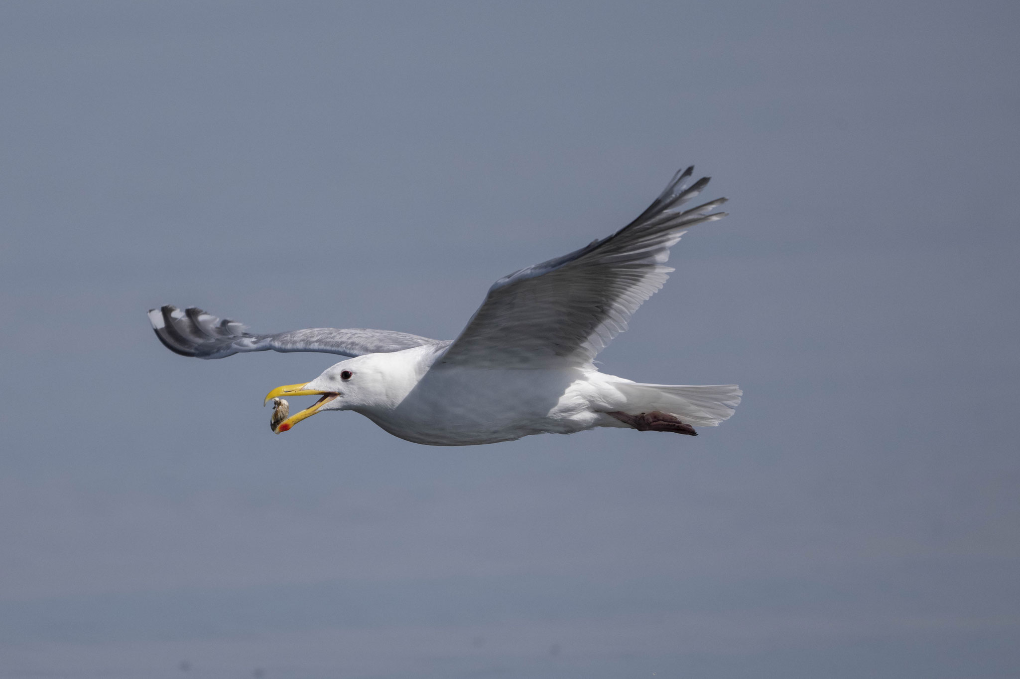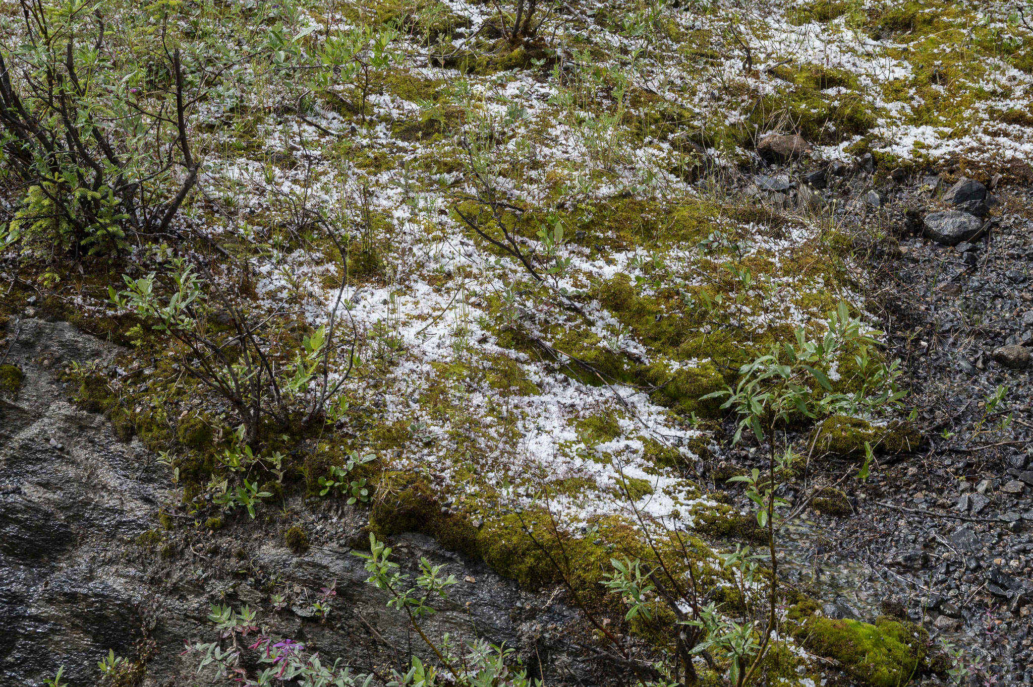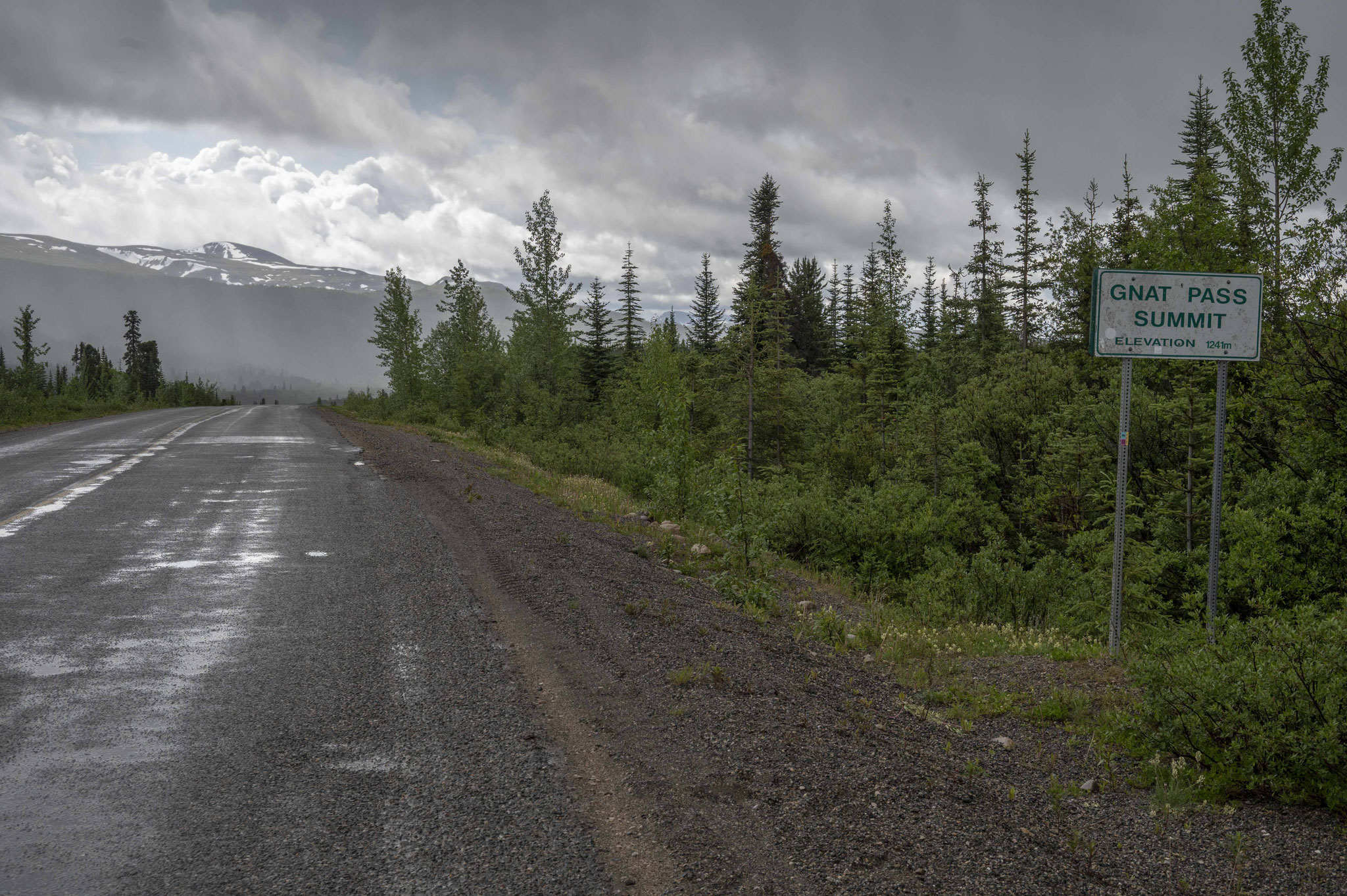 Der kommende Tag ist nichts für Schönwetterfahrer. Nachts hatte es geregnet und ich muss mein Zelt nass einpacken. Und der Regen begleitet mich auch am Tag über weite Strecken. Dazu bläst mir ein eisiger Wind ins Gesicht und ich muss über den 1241m hohen Gnat Pass. Auf dem Anstieg fallen die Temperaturen immer weiter und landen schließlich bei 3,4° C, die sich durch den Wind noch viel kälter anfühlen. Ich muss zusätzliche warme Sachen anziehen. Ausgerechnet als ich mit freiem Oberkörper im Regen und Wind stehe und ein Funktionsshirt anziehen will, kommt eine Polizeistreife vorbei und fragt, ob alles in Ordnung ist – seine Gedanken hätte ich in diesem Moment gern lesen können. Auf der Passhöhe kommt dann noch ein Hagelschauer dazu. Normalerweise hätte ich jetzt irgendwo an einem halbwegs geschützten Ort mein Zelt aufgebaut und auf bessere Bedingungen gewartet, aber ich habe ein Date in Vancouver… Immerhin wird es wieder wärmer, als ich die Passhöhe hinter mir habe.
