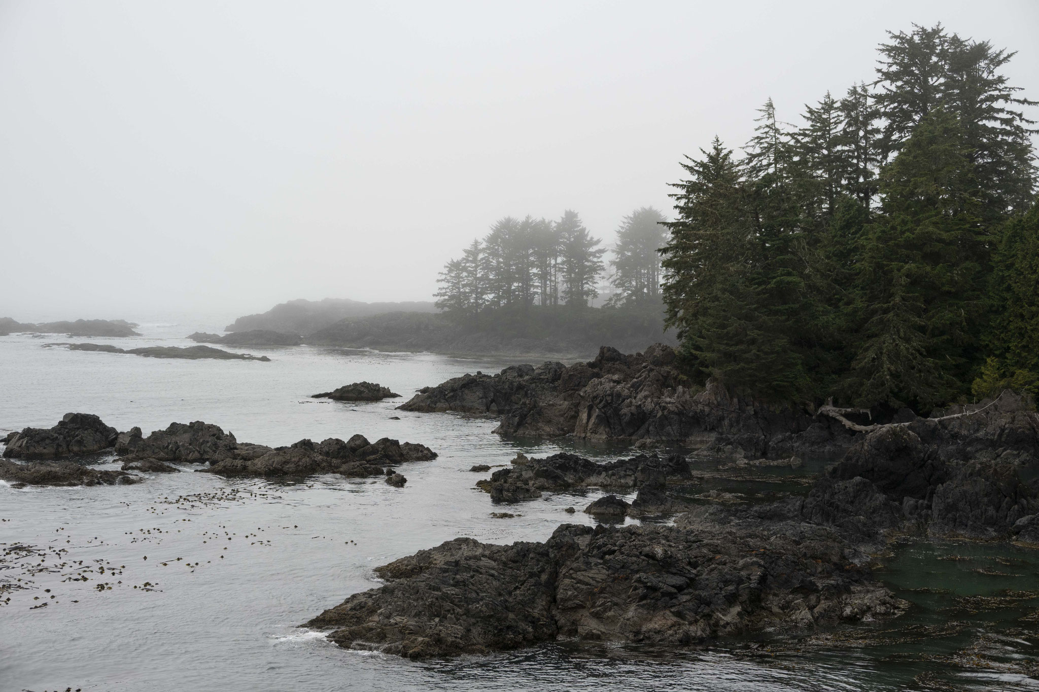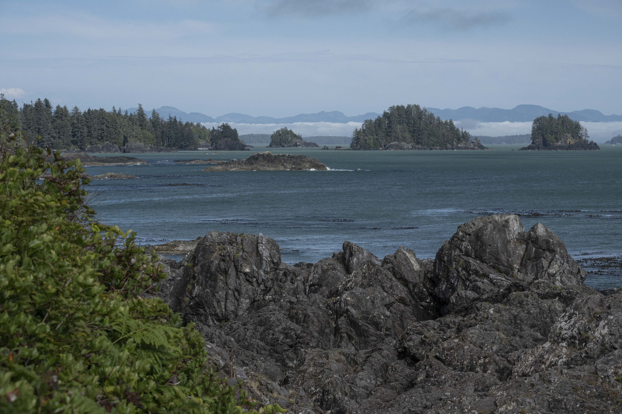 Bevor wir uns auf den Rückweg zum Festland machen – zwei Wochen sind schnell vorüber – steht noch ein Ausflug nach Tofino und Ucluelet. Die Gegend um Tofino ist das Pendent zu Sylt mit Kampen, zumindest was das Preisniveau angeht. Die Lage ist tatsächlich spektakulär. Auf der einen Seite der offene Pazifik mit den besten Sandstränden von ganz Vancouver Island, was den Ort zu einem Surferparadies macht, auf der anderen Seite der Halbinsel eine geschützte Fjord- und Inselwelt für Motorboote und Kajaks. Die Übernachtungspreise sind so utopisch hoch, wenn man denn kurzfristig überhaupt etwas findet, dass wir in Port Alberni in einem B&B einchecken und nur eine Tagesausflug an die Küste machen – ca. 15 Grad Temperaturunterschied auf 100km inbegriffen. Nach Wanderungen im Nationalpark und an der Küste geht’s zurück in die Unterkunft und dann treten wir den Rückweg auf das Festland an, wenn wir denn einen Platz auf einer Fähre bekommen.