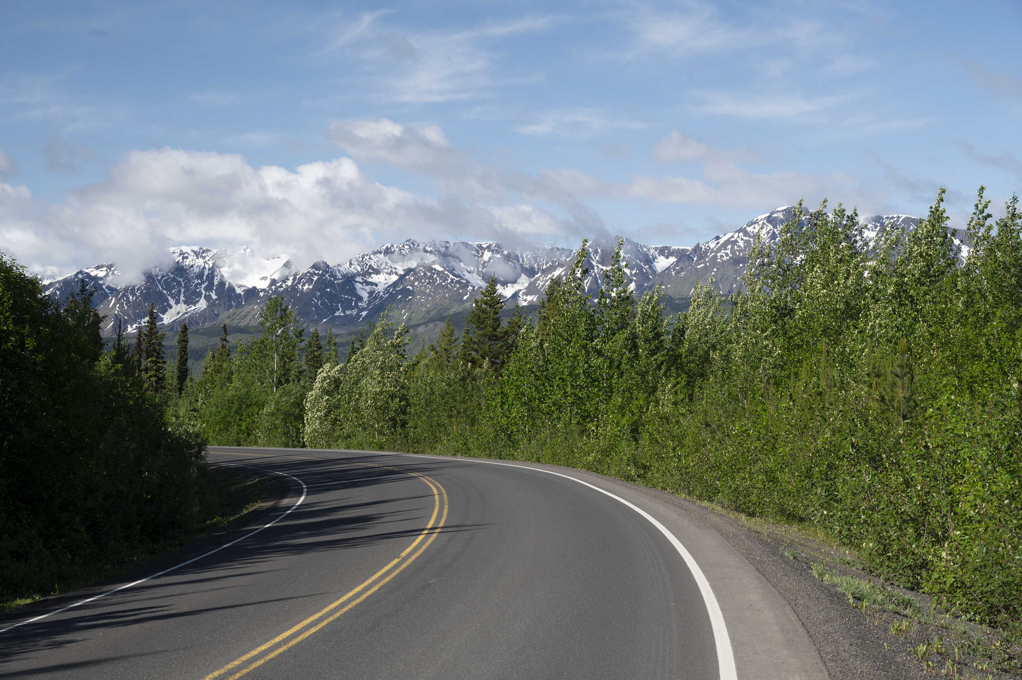 Infratruktur, Versorgungsmöglichkeiten und auch die Straße sind noch dürftiger als in Alaska. Und als ich nach mehr als 100 schweren Kilometern in Burbush Landing ankomme, hat der einzige Laden mit einem Imbiss bereits geschlossen. Also noch einmal in den Sattel geschwungen, um die 16 Kilometer bis Destruction Bay zu fahren, die ich aber glücklicherweise in einem Pilotcar in einer Baustelle deutlich verkürzen kann. In Destruction Bay will ich mich eigentlich mit Martin treffen, der heute deutlich schneller als ich unterwegs ist. Von ihm gibt es aber keine Spur. Dafür aber einen deftigen Hamburger und einen kostenlosen Platz zum Zelten in den Büschen am Straßenrand. Als ich am nächsten Morgen gerade mein Frühstück beendet habe, erreicht auch Martin Destruction Bay. Er hatte in Burbush Landing am Lake Kluane übernachtet. Allerdings hatte er am Morgen kein Pilotcar, das ihn aufnahm, da die Baustelle wegen des bevorstehenden Nationalfeiertags ruhte.