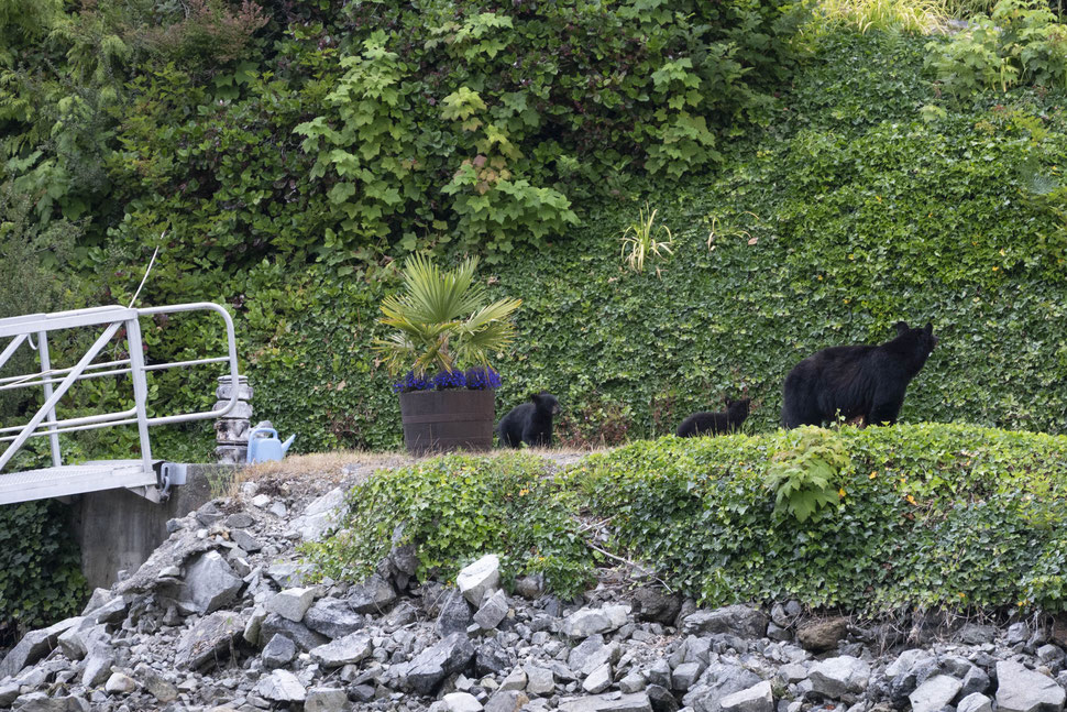 Wir verlassen Victoria und reisen ohne festen Plan über die Insel. Zuerst an die sehr einsame Westküste, wo es teilweise sehr weite Strecken nur staubige Schotterpisten gibt. Auf einer solchen Straße erreichen wir nach Stunden Bamfield, einer der beiden Start- und Endpunkte des berühmten und sehr anspruchsvollen West Coast Trails. Zum Abendessen müssen wir mit dem Wassertaxi über eine kleine Bucht in einen nicht auf Straßen erreichbaren Ortsteil übersetzen. Im Restaurant werden wir gleich mit dem Hinweis begrüßt, dass wir gerade einen Schwarzbären mit zwei Jungen verpasst hätten, der am Ufer mitten im Ort nach Futter gesucht hat. Als unser Wassertaxifahrer uns wieder abholt, erzählt er, dass er die kleine Familie ebenfalls gerade gesehen hat und statt uns auf direktem Weg zurückzubringen, sucht er mit Erfolg noch einmal das Ufer ab und aus nächster Nähe können wir die drei Petze beobachten, wie sie am Ufer und in Gärten nach Freßbarem suchen, bis ein Hund sie in die Bäume treibt.