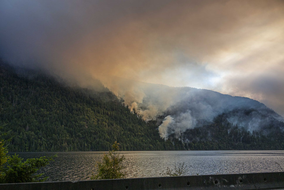 Auf ganz Vancouver Island und auch dem Festland gilt weitgehend ein absolutes Verbot, Lagerfeuer anzuzünden (für viele Kanadier ein ablusutes Muss auf dem Campingplatz), weil es aufgrund der Hitze der letzten Wochen vielerorts knochentrocken ist. An unserem letzten Tag auf Vancouver Island kommen wir noch einmal durch Cathedral Grove und kurz danach sehen wir, wie ernst es mit der Waldbrandgefahr ist. Ein ganzer Berghang steht in Flammen und der Rauch beißt in der Nase. Es bleibt zu hoffen, dass das Feuer schnell gelöscht wird, bevor es die Baumriesen erreichen kann. Auch wenn sie durch ihre dicke Rinde gut gegen Waldbrände geschützt sind, möchte man sich den Schaden nicht vorstellen.