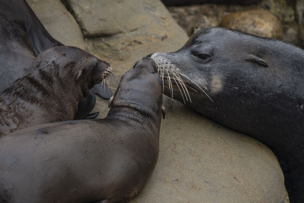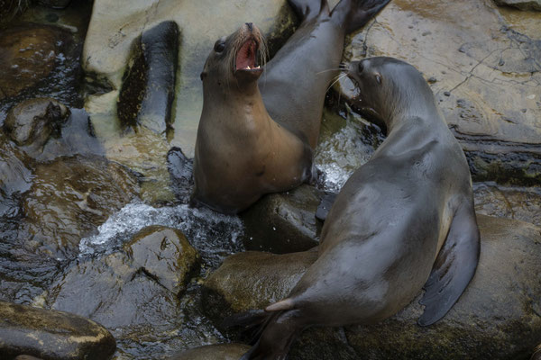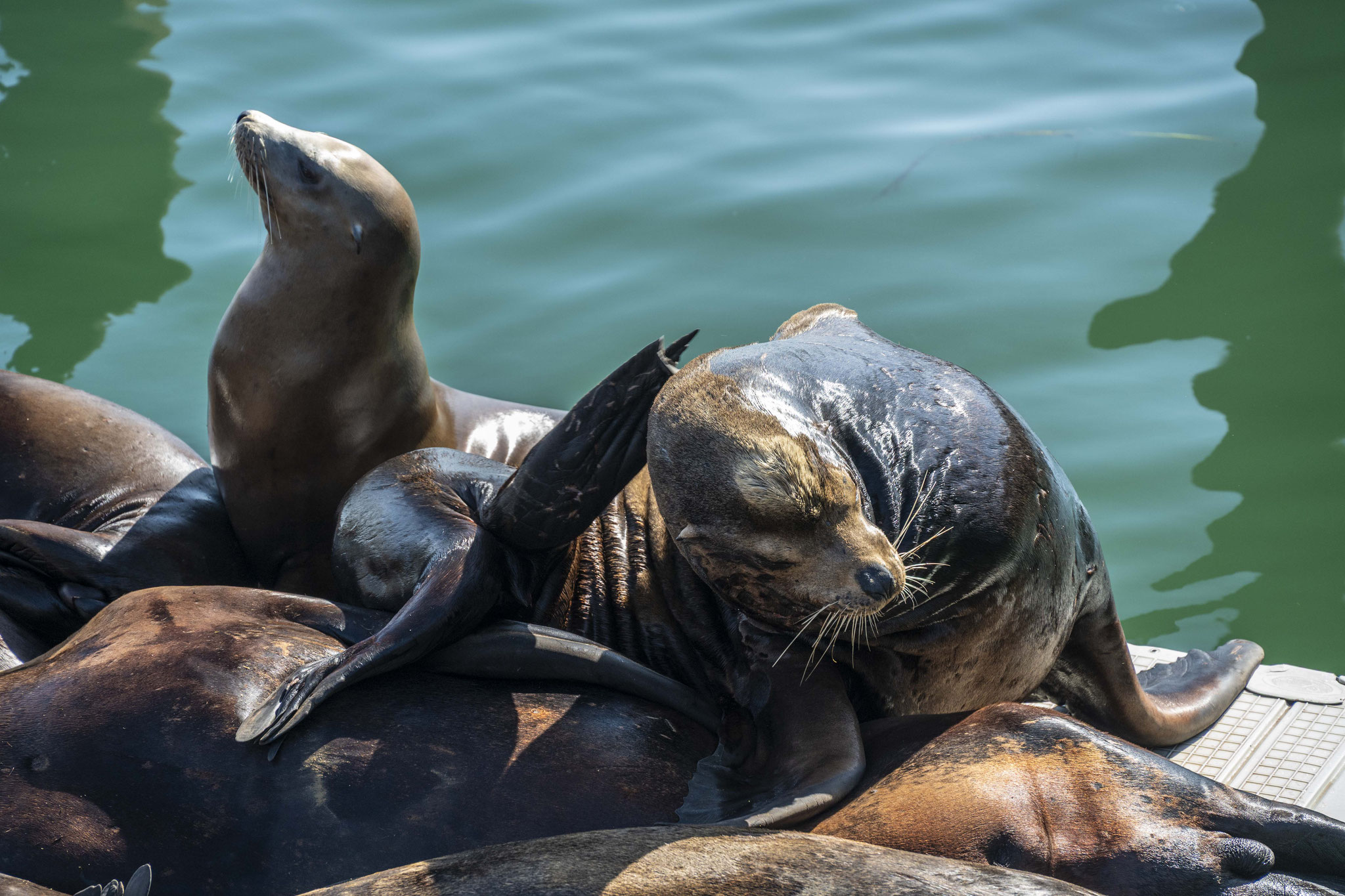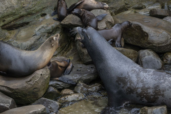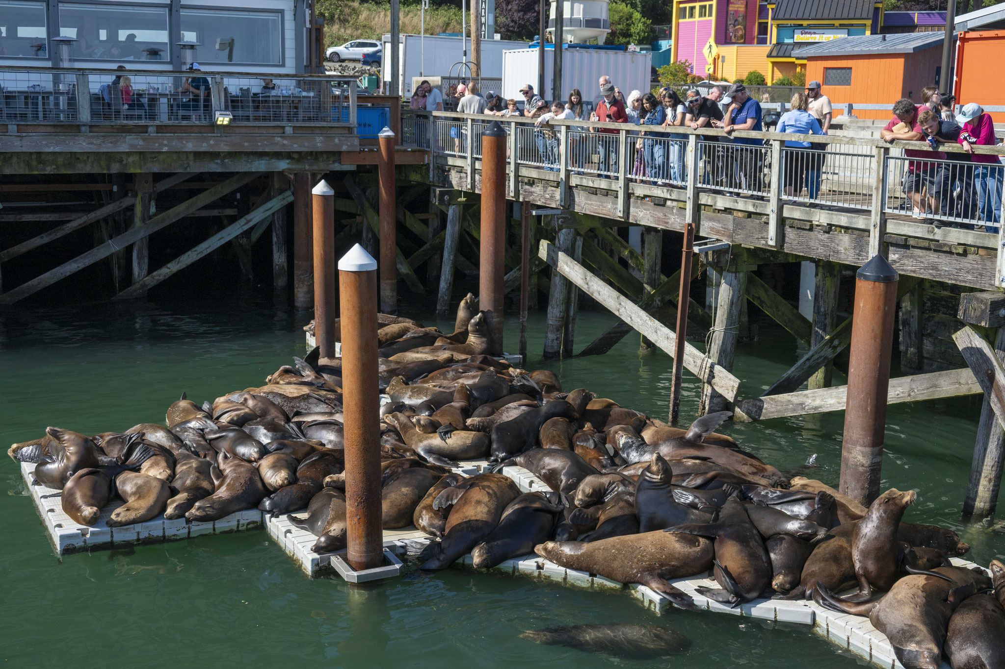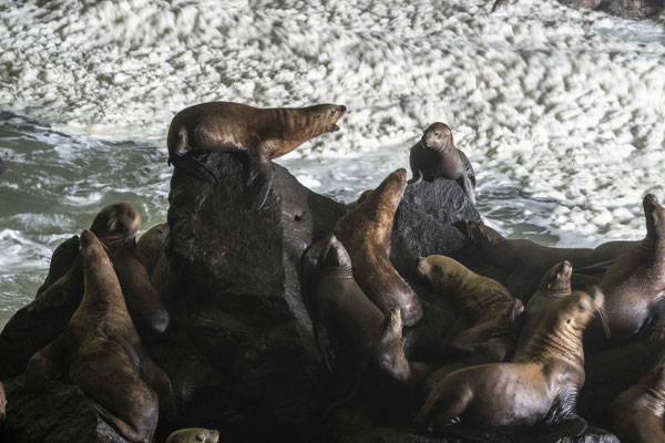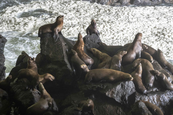 In Newport ergänze ich meine Vorräte und mache noch einen Abstecher in die „Altstadt“ oder das, was hier im Westen dafür hält. Nicht, dass es hier besondere architektonische oder städtebauliche Highlights zu besichtigen gäbe, aber im Fischereihafen haben sich Seelöwen breit gemacht und direkt unterhalb eines Stegs drängen sich ca. 100 Tiere auf einem Ponton und dösen in der Sonne, bis ein Neuankömmling einen Platz sucht und damit für Streit sorgt. Weil nicht alle Tiere auf der kleinen Plattform unterkommen, drängen sich weitere Seelöwen etwas abseits auf einem Steinwall. Ein faszinierendes Schauspiel aus nächster Nähe – wenn nur der Gestank nicht wäre…