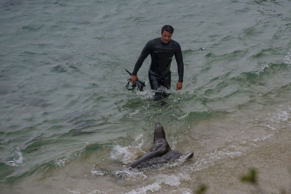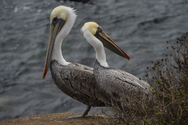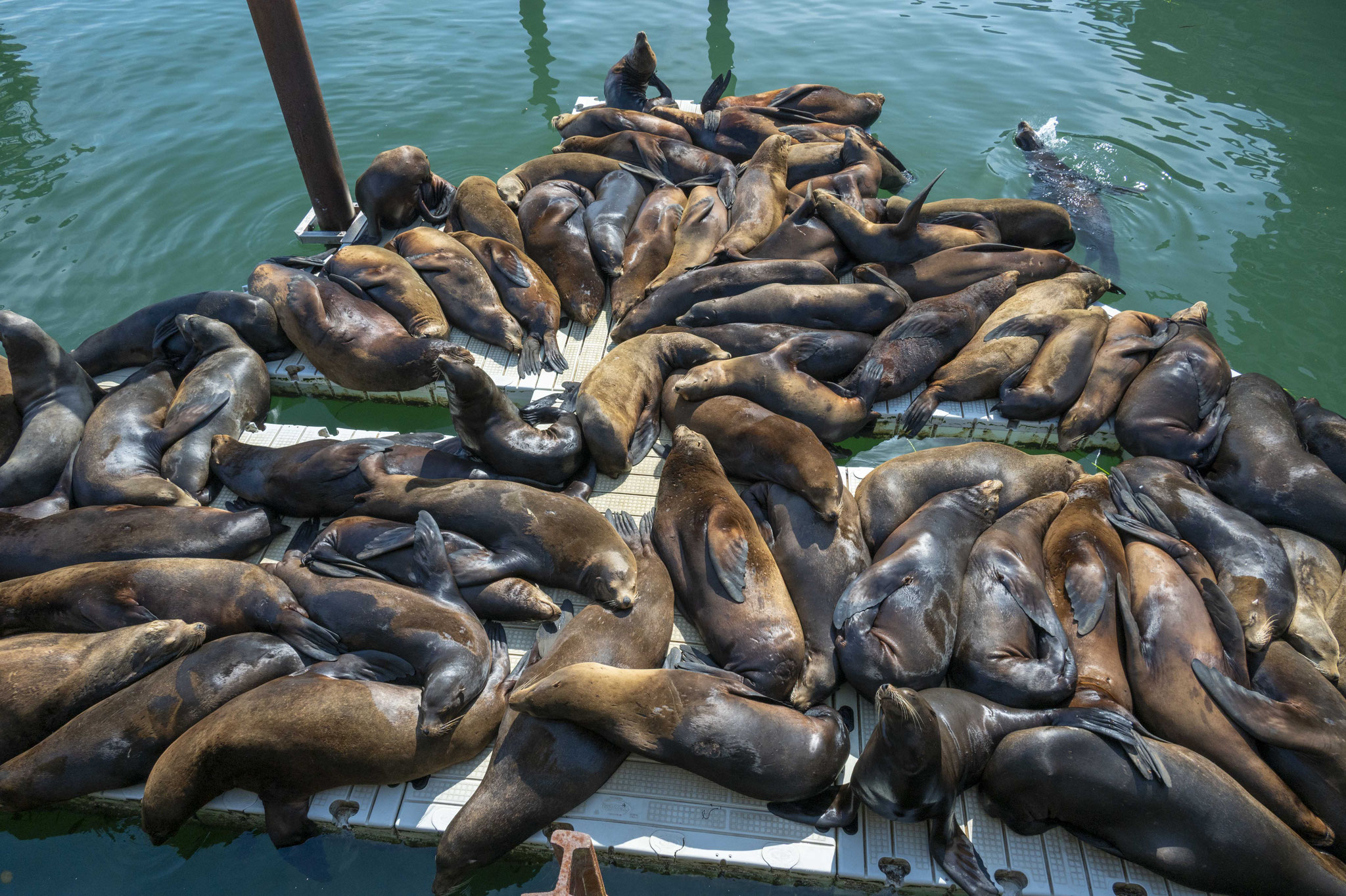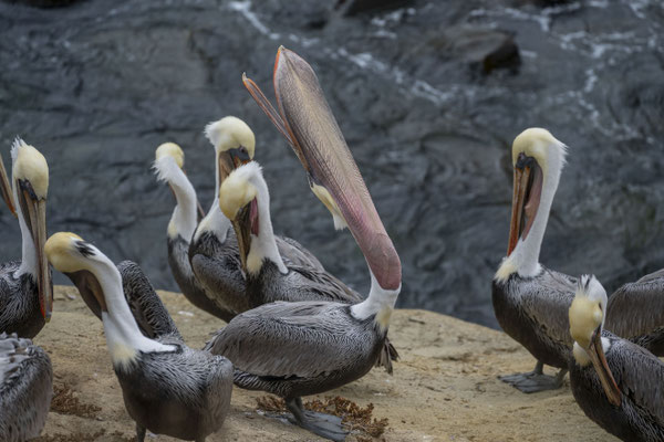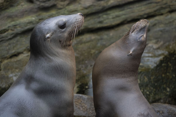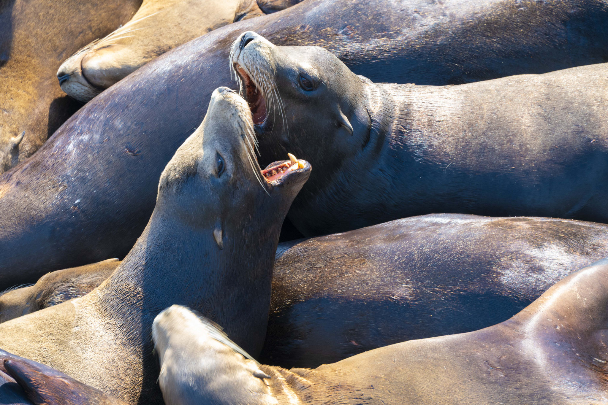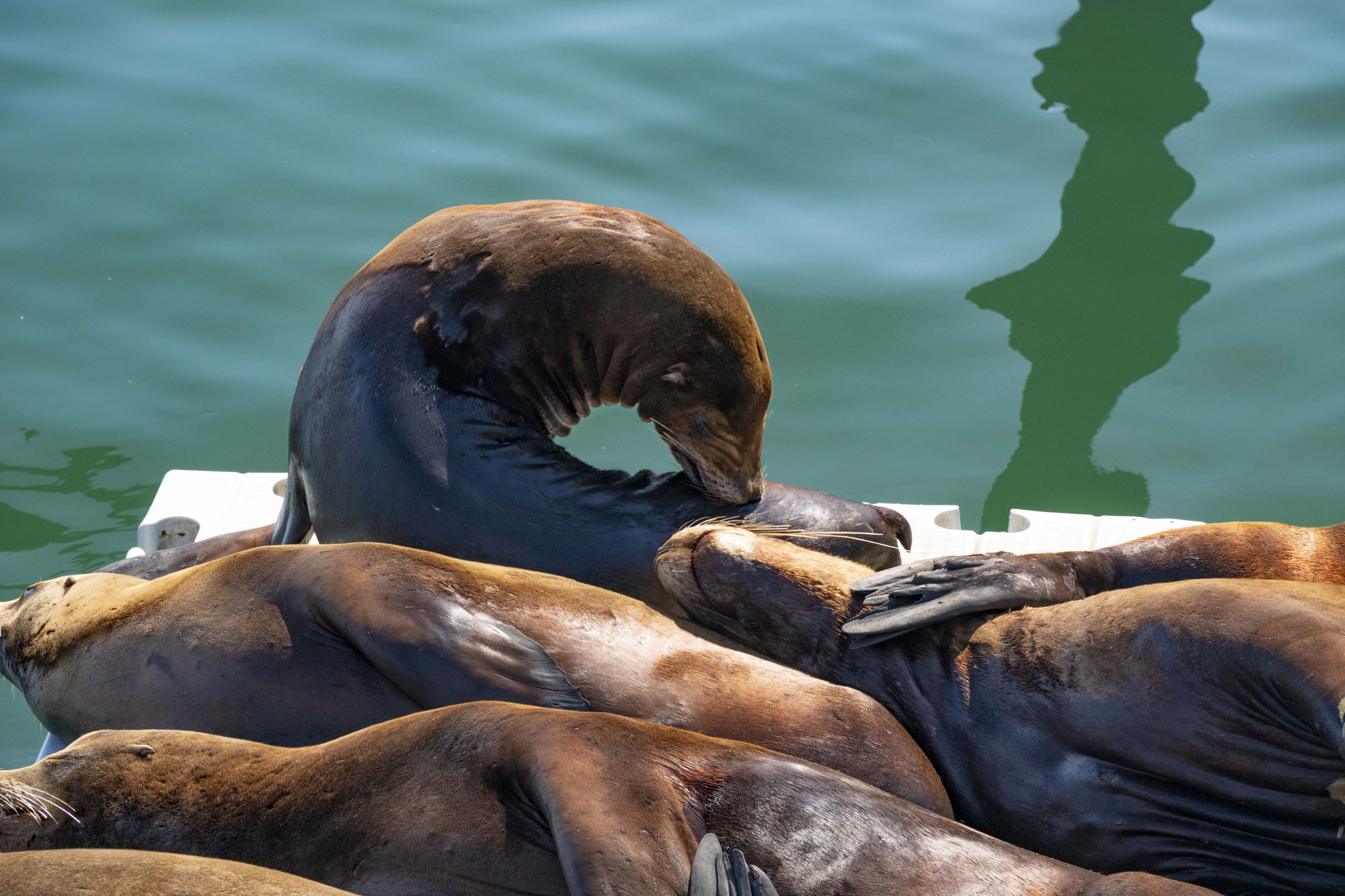 In Newport ergänze ich meine Vorräte und mache noch einen Abstecher in die „Altstadt“ oder das, was hier im Westen dafür hält. Nicht, dass es hier besondere architektonische oder städtebauliche Highlights zu besichtigen gäbe, aber im Fischereihafen haben sich Seelöwen breit gemacht und direkt unterhalb eines Stegs drängen sich ca. 100 Tiere auf einem Ponton und dösen in der Sonne, bis ein Neuankömmling einen Platz sucht und damit für Streit sorgt. Weil nicht alle Tiere auf der kleinen Plattform unterkommen, drängen sich weitere Seelöwen etwas abseits auf einem Steinwall. Ein faszinierendes Schauspiel aus nächster Nähe – wenn nur der Gestank nicht wäre…