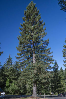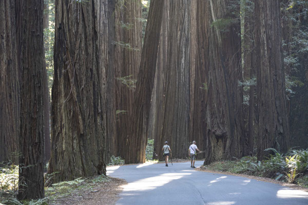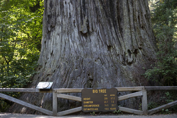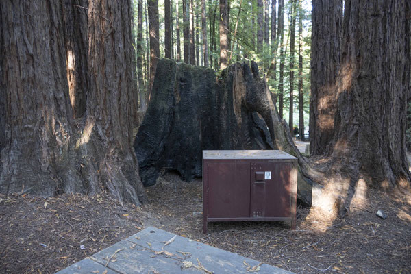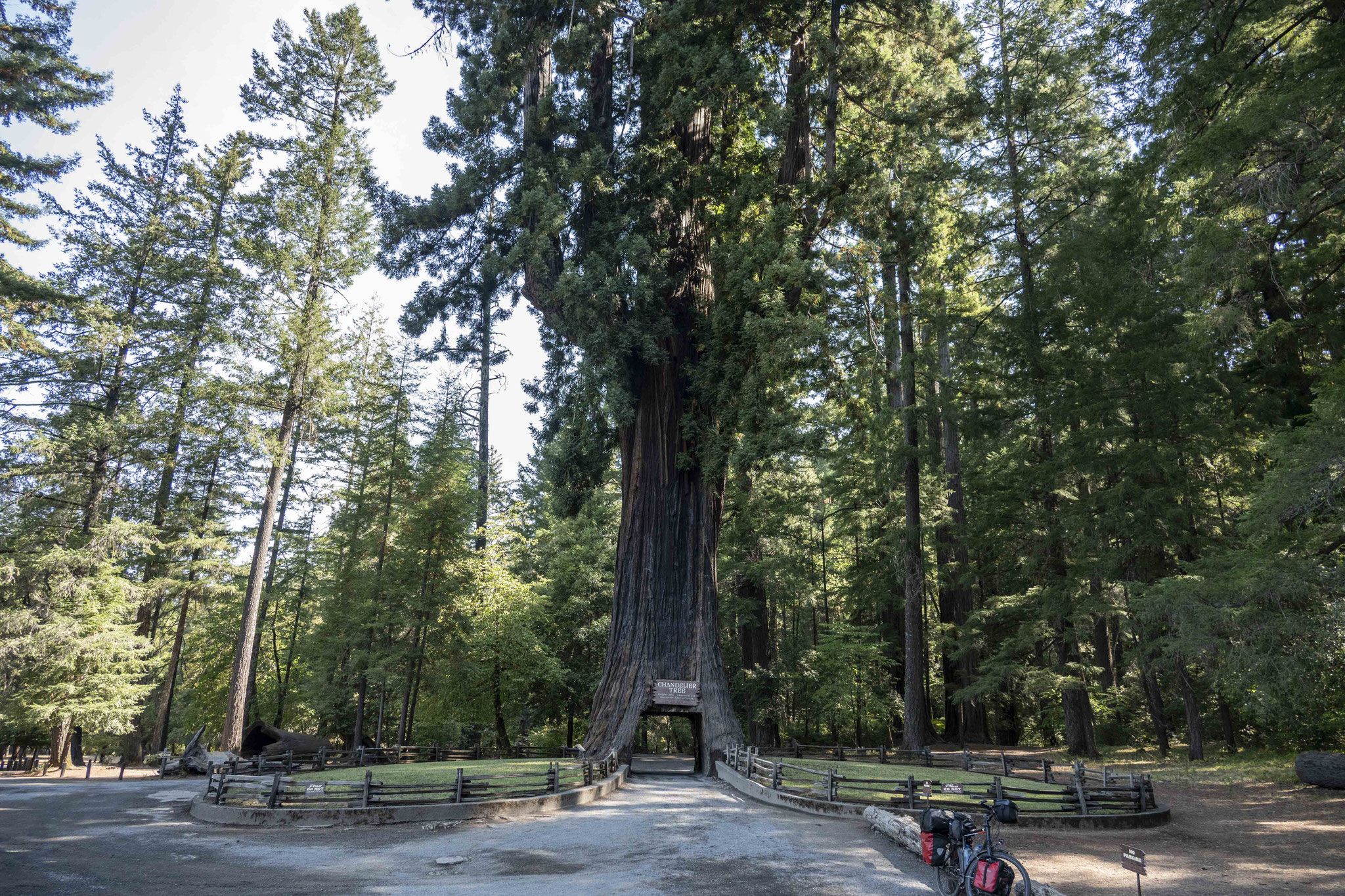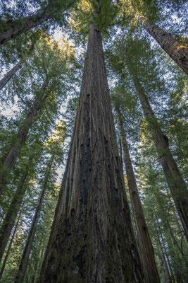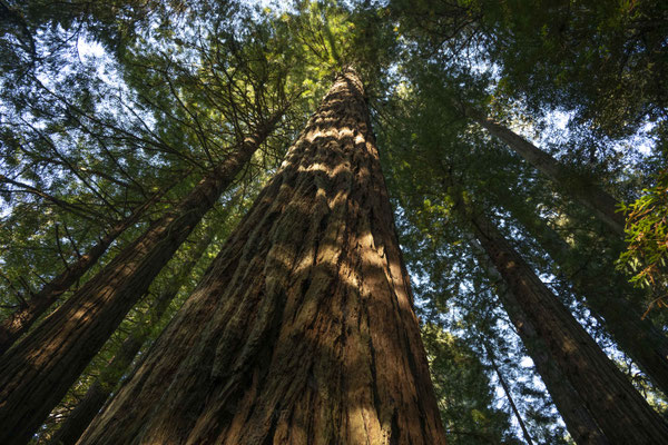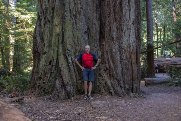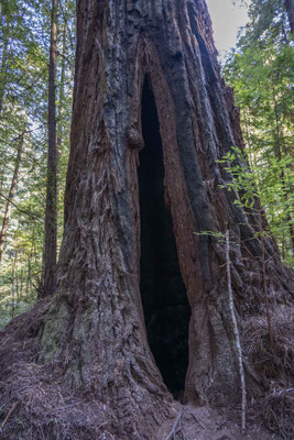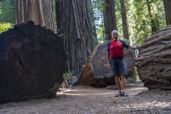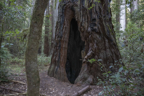 In den folgenden Tagen bin ich noch mehrfach in verschiedenen Parks mit riesigen und sehr alten Bäumen gewesen. Immer wieder stehe ich staunend vor diesen gewaltigen Holzsäulen, die mindestens 50m völlig astfrei sind. Viele Bäume weisen Spuren großer Waldbrände auf. Die Rinde ist eigentlich feuerresistent, wenn aber eine Beschädigung vorhanden ist, brennen die oft im unteren Bereich morschen Stämme von innen aus und es bilden sich große Höhlen. Die Bäume wachsen trotzdem weiter, nur irgendwann fällt auch der größte Baum – und bleibt einfach liegen. Sind eben Nationalparks. Manch einer, der so einen alten Baum sein Eigen nennen darf, macht daraus ein Geschäft, sägt ein großes Loch in den Baum und lässt Menschen gegen Bares durch den Baum fahren. Das Geschäftsmodell funktioniert anscheinend noch, allerdings sind die meisten der hiesigen Autos inzwischen so groß, dass sie steckenbleiben würden.