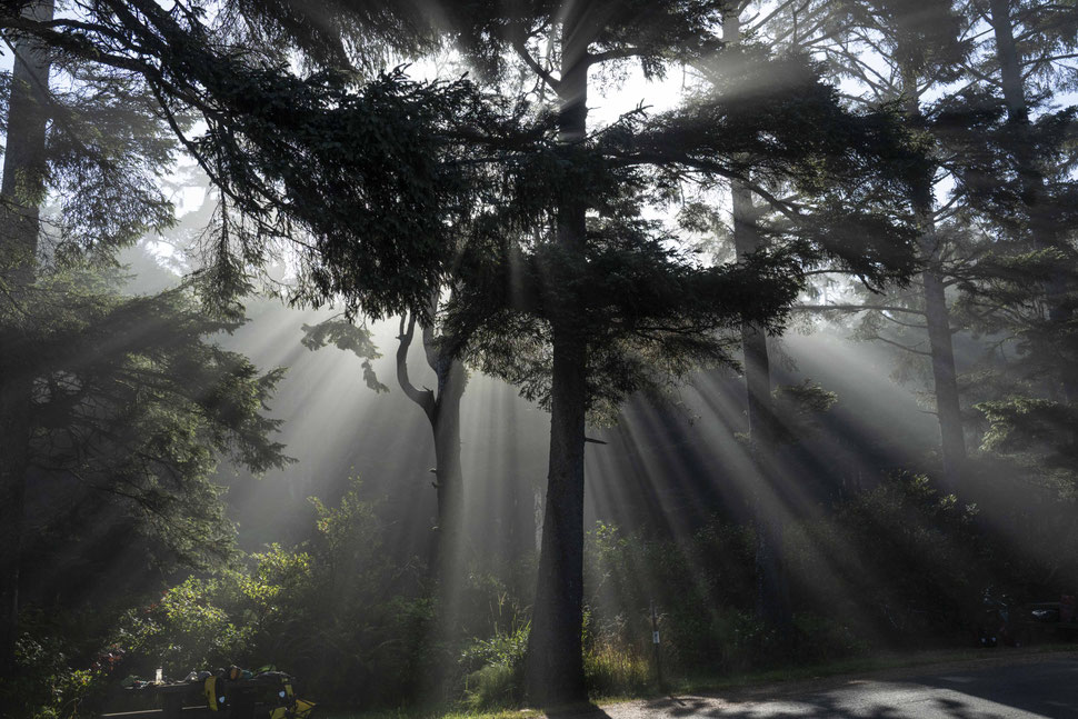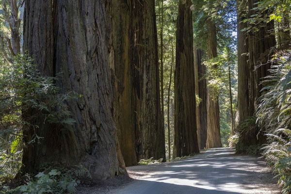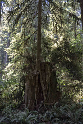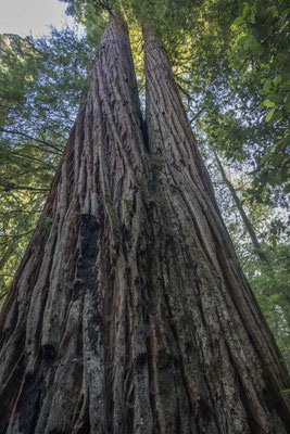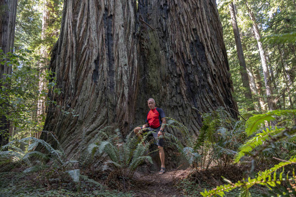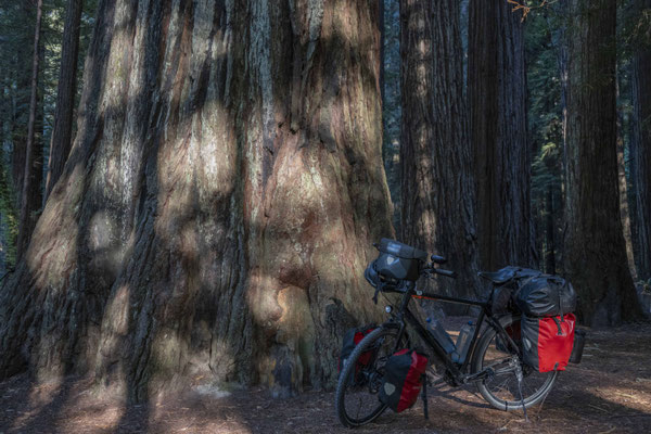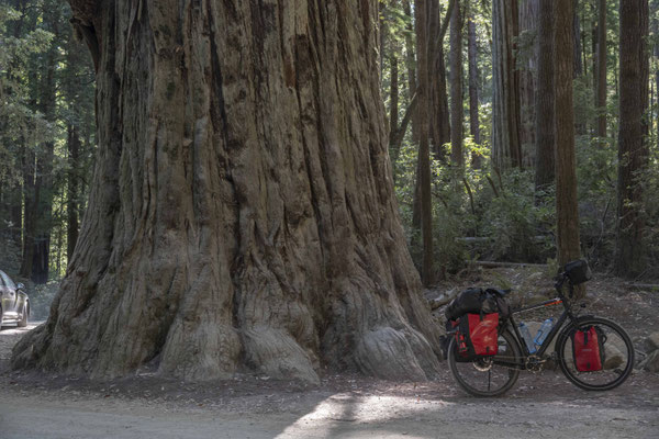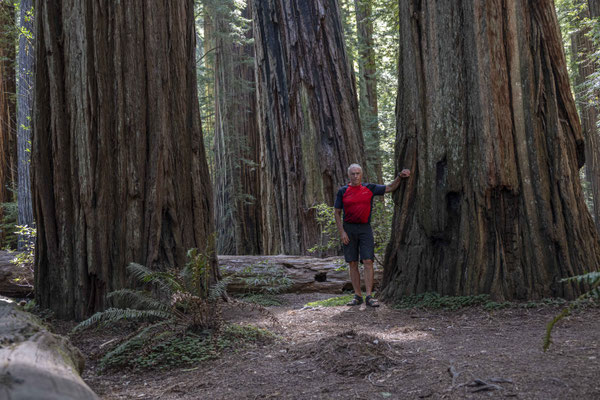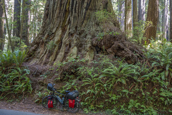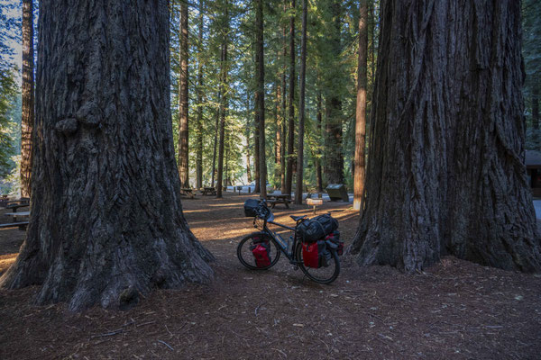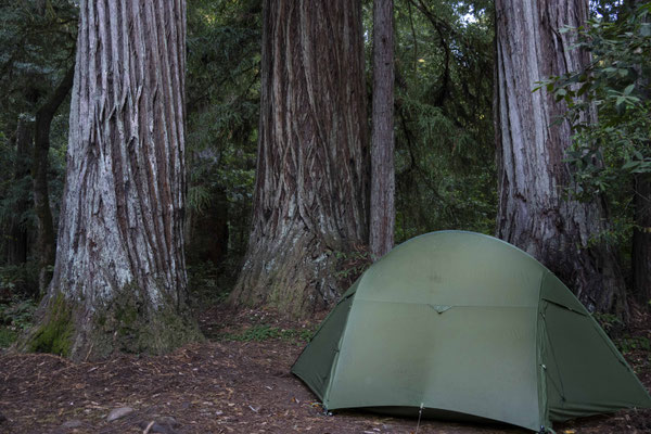 Dafür ist der Campingplatz im Jedediah Smith Redwoods State Park umso beeindruckender. Die meisten National- und State Parks hier im Norden Kaliforniens sind dem Schutz der alten Coastal Redwoods gewidmet. Es sind die höchsten Bäume der Welt, die mehr als 110m Höhe erreichen und über 2000 Jahr alt werden können. Noch rechtzeitig bevor auch die letzten 5% des ursprünglichen Bestandes der Axt bzw. der Säge zum Opfer gefallen sind, wurden sie unter strengen Schutz gestellt – und ich stelle mein Zelt mitten in diesem Wald zwischen den Riesen auf. Ganz allein, weit und breit kein anderer Camper. Da fühlt man sich ganz schön klein und wird sehr ehrfürchtig gegenüber dieser Natur. Mein erster Gedanke: Das ist kein Wald, das ist eine Kathedrale. Es ist schwer, diese Eindrücke in Bildern widerzugeben, ich versuche es trotzdem…