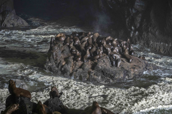Gespräche und zahlreiche Zwischenstopps verkürzen die geplante Tagesetappe deutlich, aber hier in Oregon findet sich immer ein State Park und ein Hiker-Biker-Platz ist auch problemlos zu bekommen. Auch der nächste Tag steht ganz im Zeichen von Leuchttürmen und einer weiteren Seelöwenkolonie. Diesmal befindet sie sich aber in der (angeblich) größten Meereshöhle Nordamerikas und liegt auf einem Privatgelände, was bedeutet, dass man tief in die Tasche greifen muss, um sie zu besichtigen. Dafür wird man dann aber auch mit einem Aufzug in die Höhle gebracht. Man kommt den Tieren bei weitem nicht so nahe wie in Newport, dafür ist der Gestank umso intensiver und die zahlreichen Fliegen machen den Aufenthalt auch nicht gerade angenehmer.