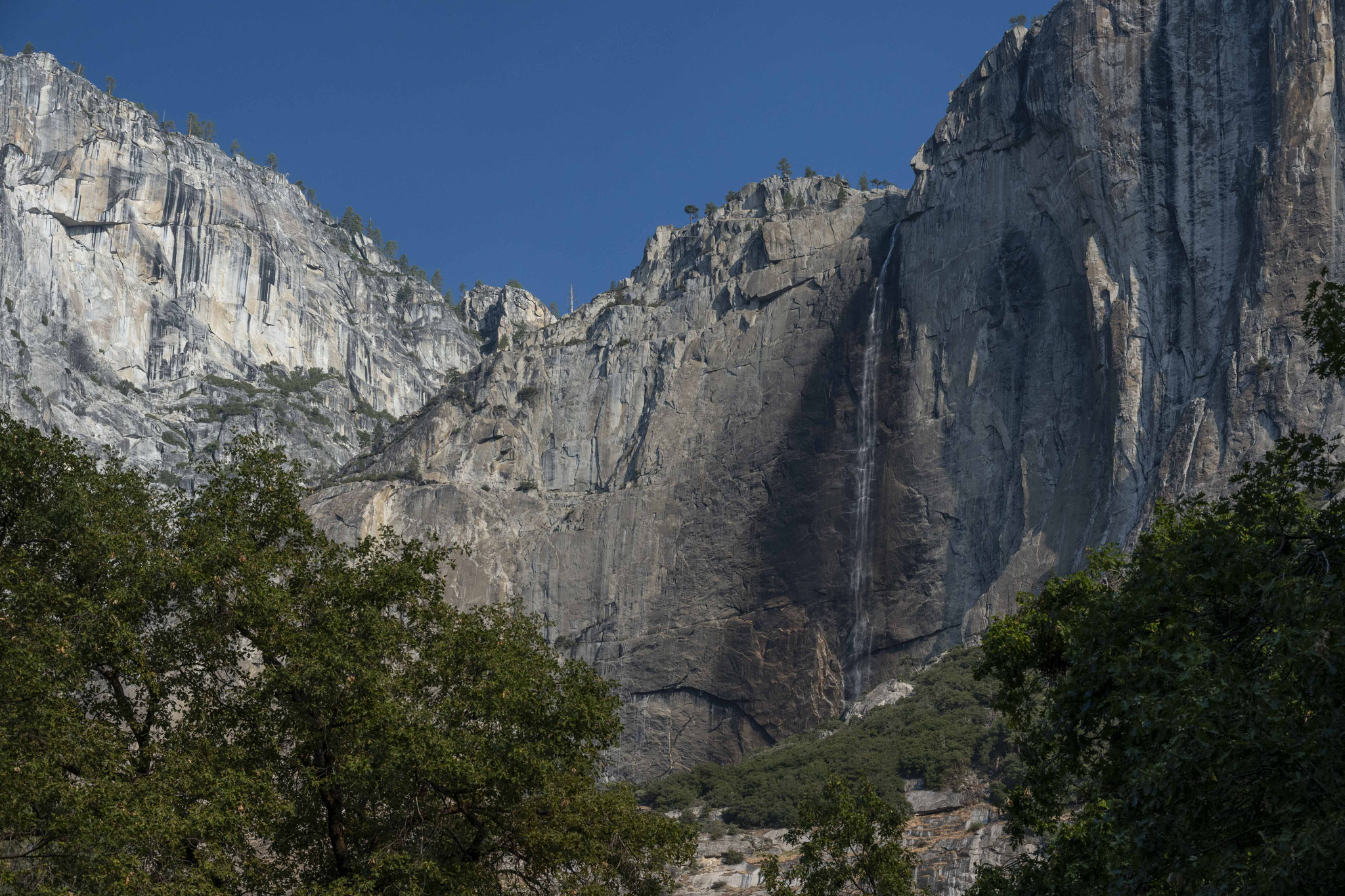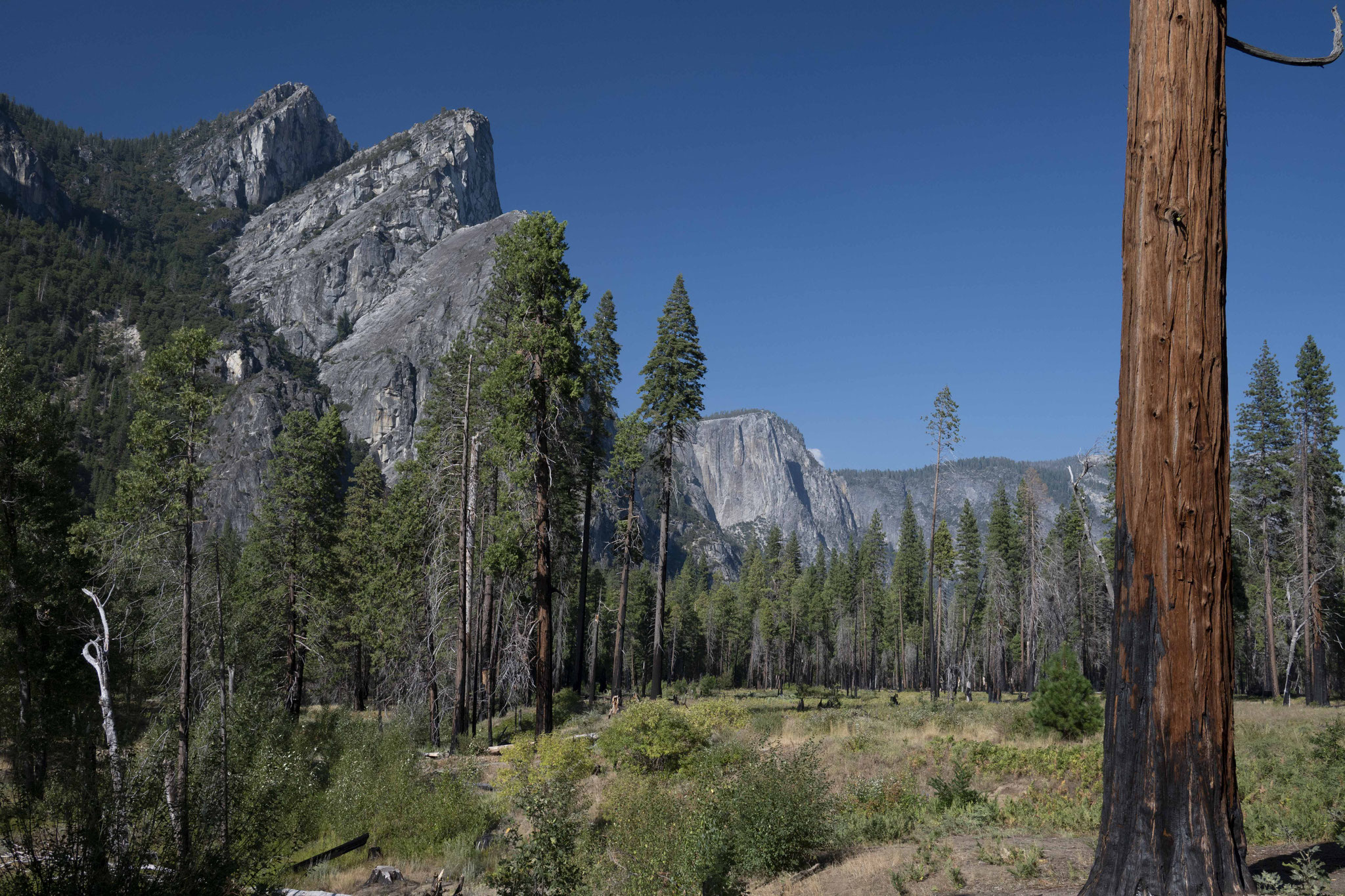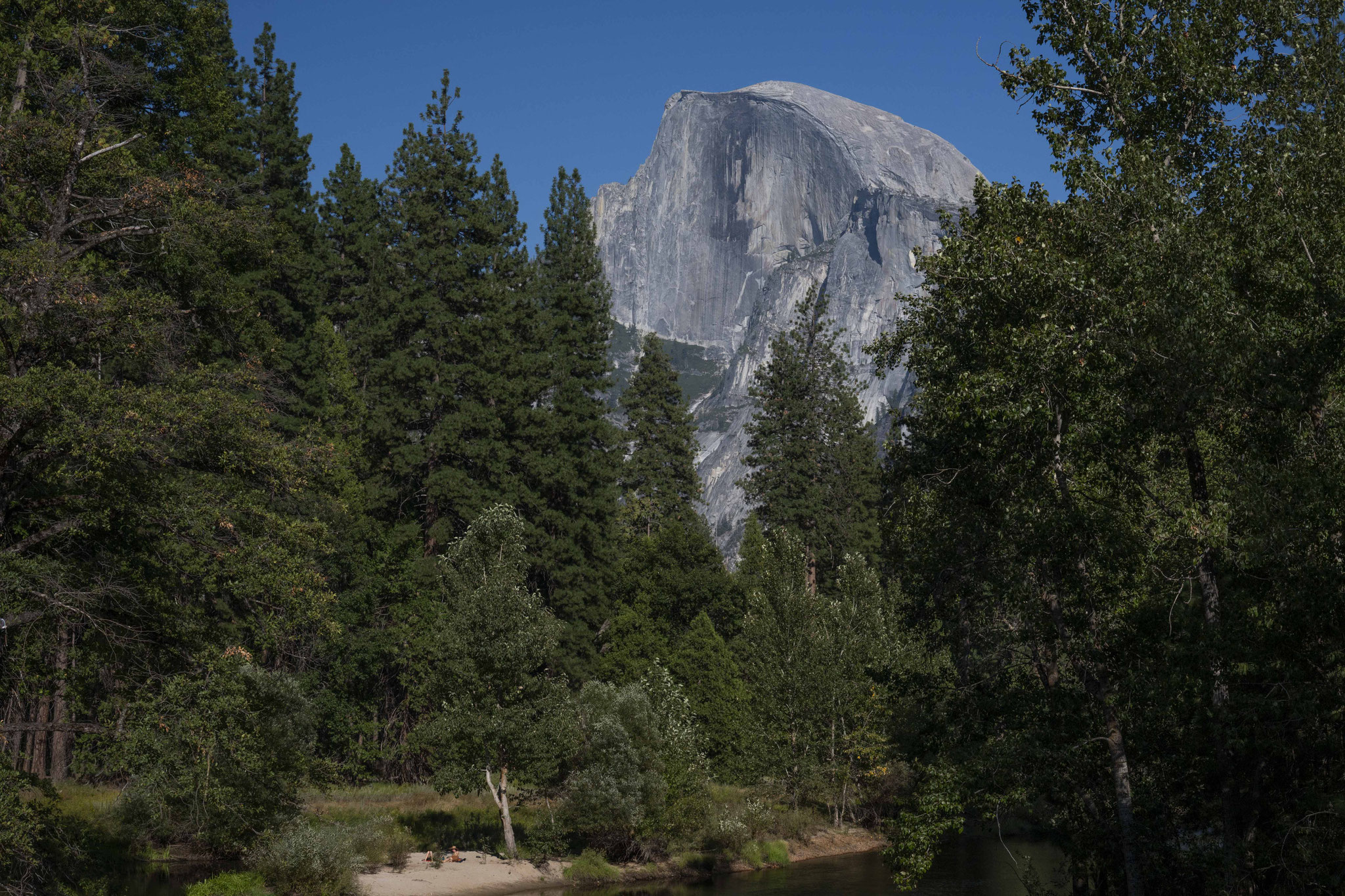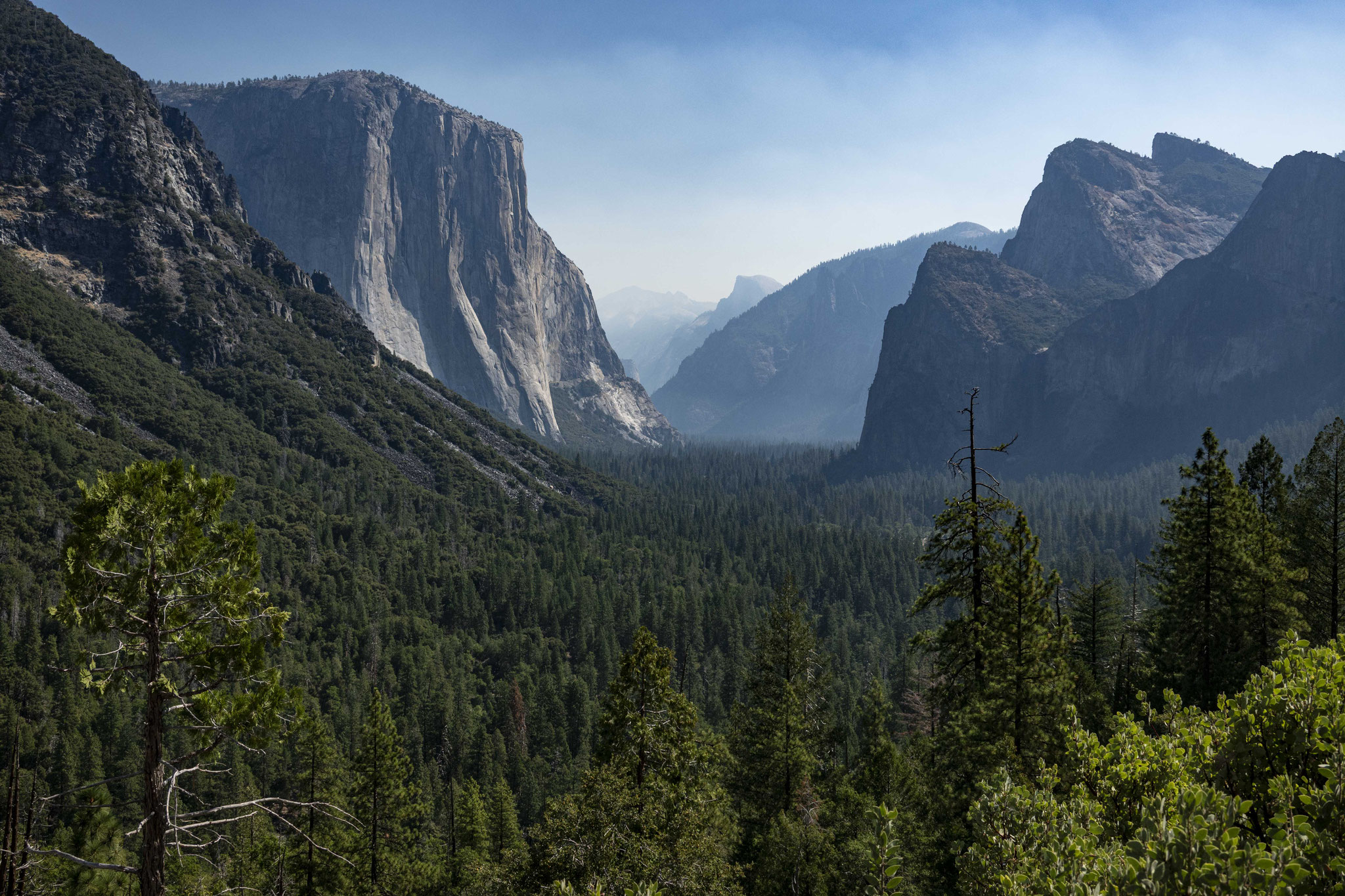 Am nächsten Morgen mache ich mich an den langen Anstieg ins Yosemite Valley, dem Herzstück des Nationalparks. Der Rauch der Waldbrände trübt die Sicht ins Tal bei sonst klarem Wetter stark und nimmt einem die Belohnung für die Mühen bis auf die Passhöhe. Auf der anderen Seite geht es dann 700 Höhenmeter ins Tal. Wie zu befürchtet, bin ich nicht der einzige Besucher im Tal – in diesem Jahr werden ca. 6 Millionen Touristen erwartet. Es herrscht Rummel. Allerdings ist die Natur auch spektakulär, nicht nur die ca. 1000 Meter hohen Granitwände von El Capitan und Halfdome, die das Ziel von Klettern aus aller Welt sind, sondern die Wasserfälle, die Berge, Flüsse und Wälder sind unglaublich schön und glücklicherweise hat es der Rauch auch nicht bis ins Tag geschafft. Natürlich kann man den Nationalpark so erst so richtig erschließen, wenn man auf den zahlreichen Trails wandert – das möchten meine Knie allerdings nicht. Also bleibe ich unten.