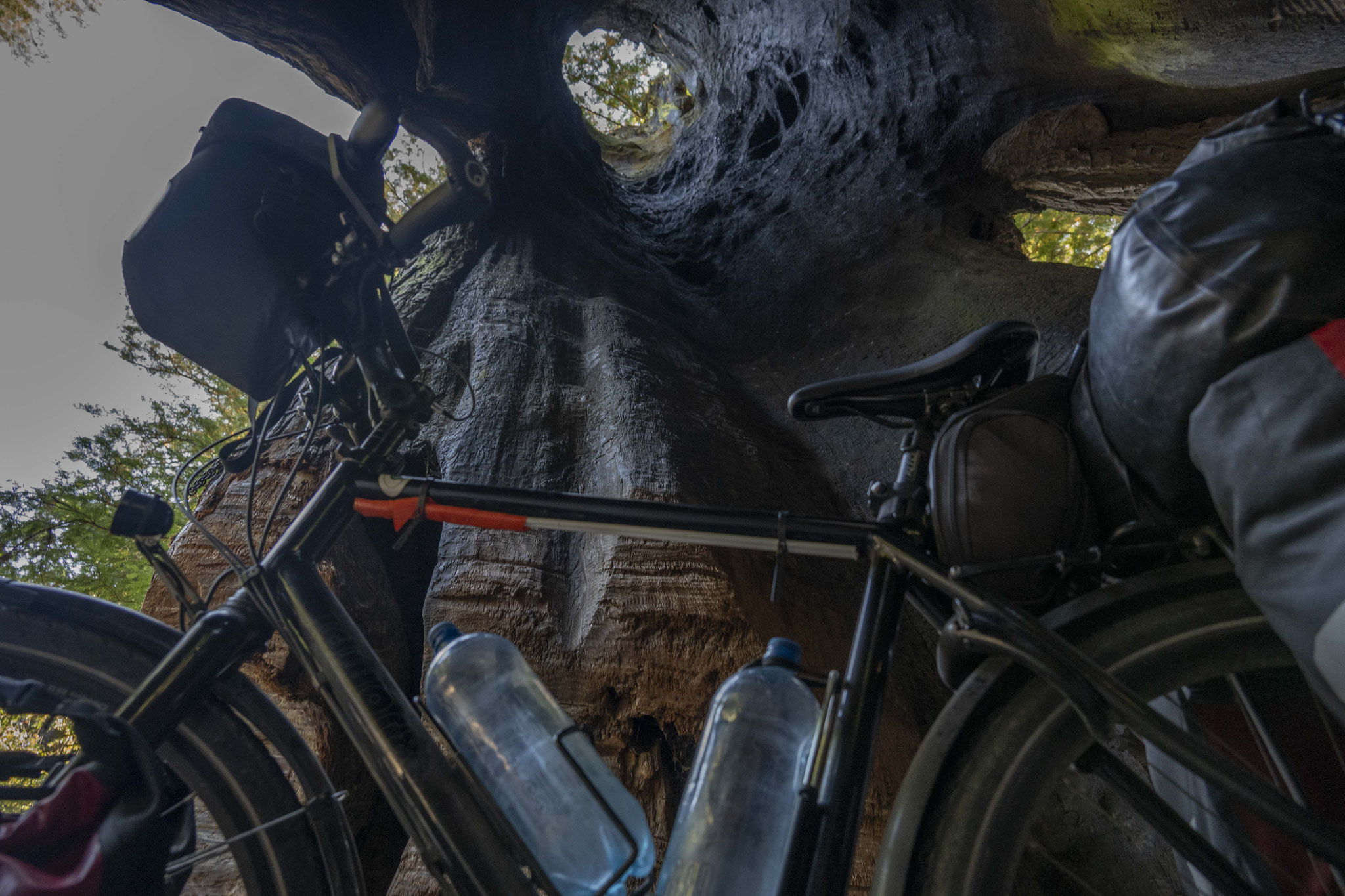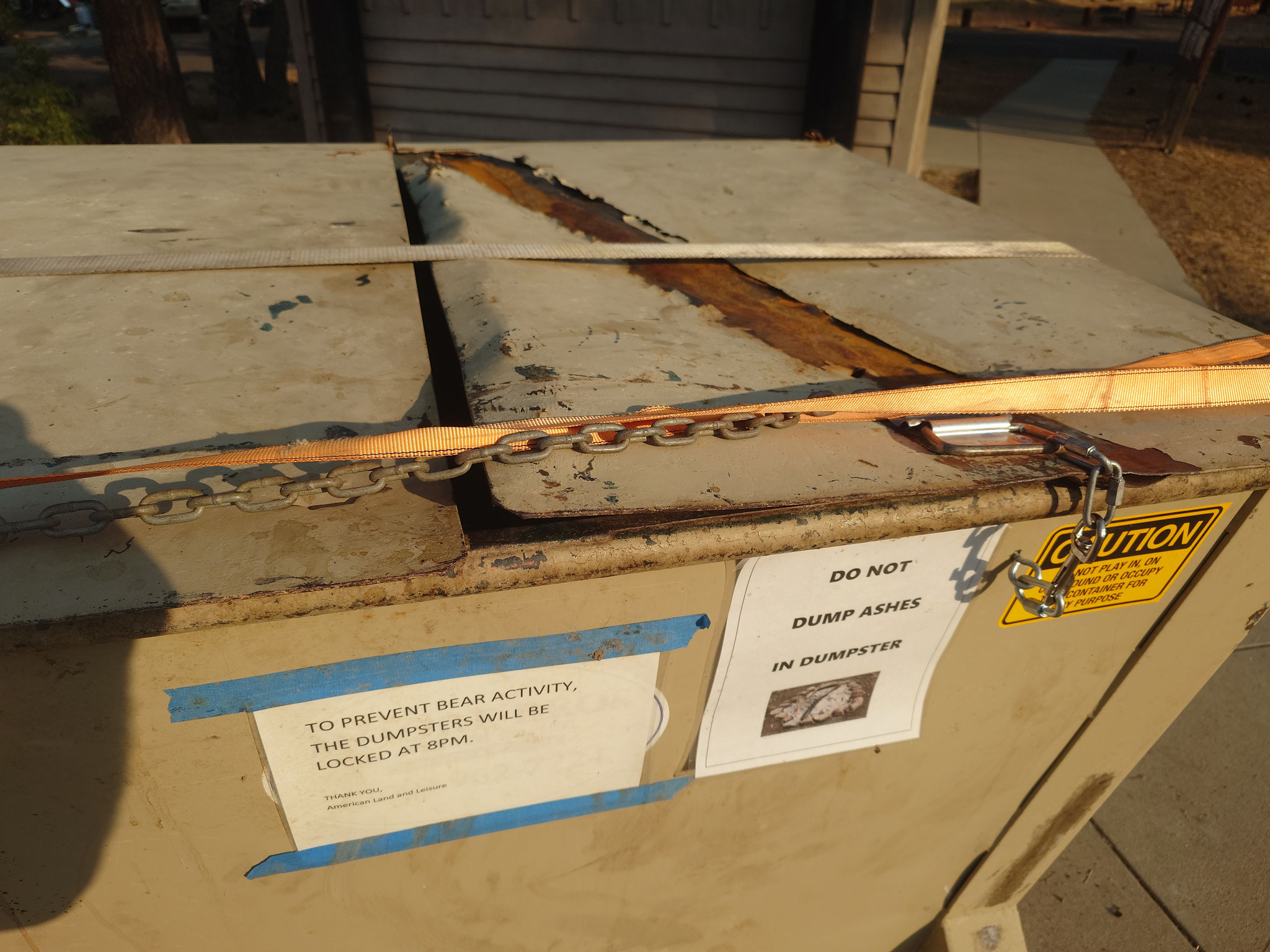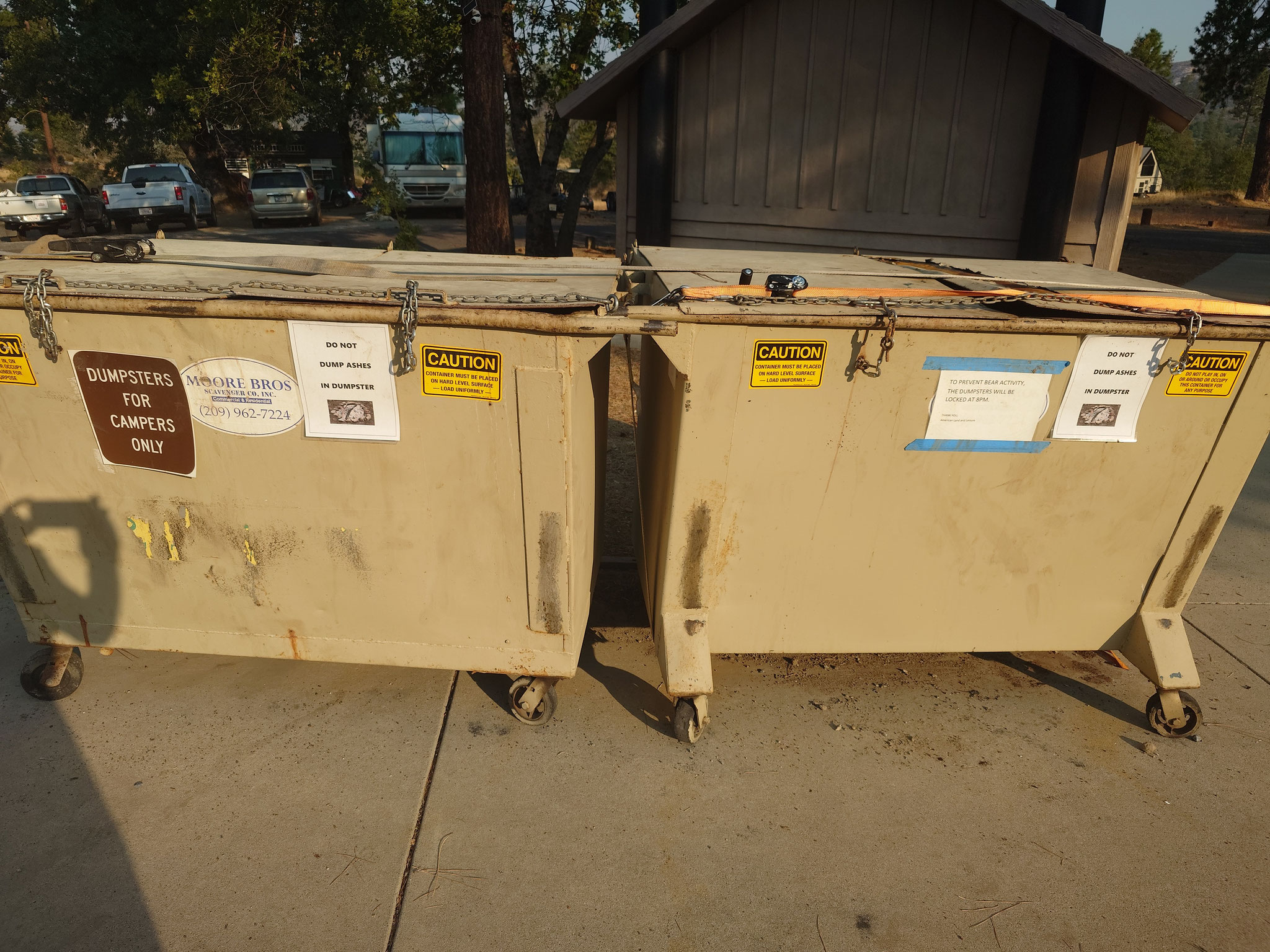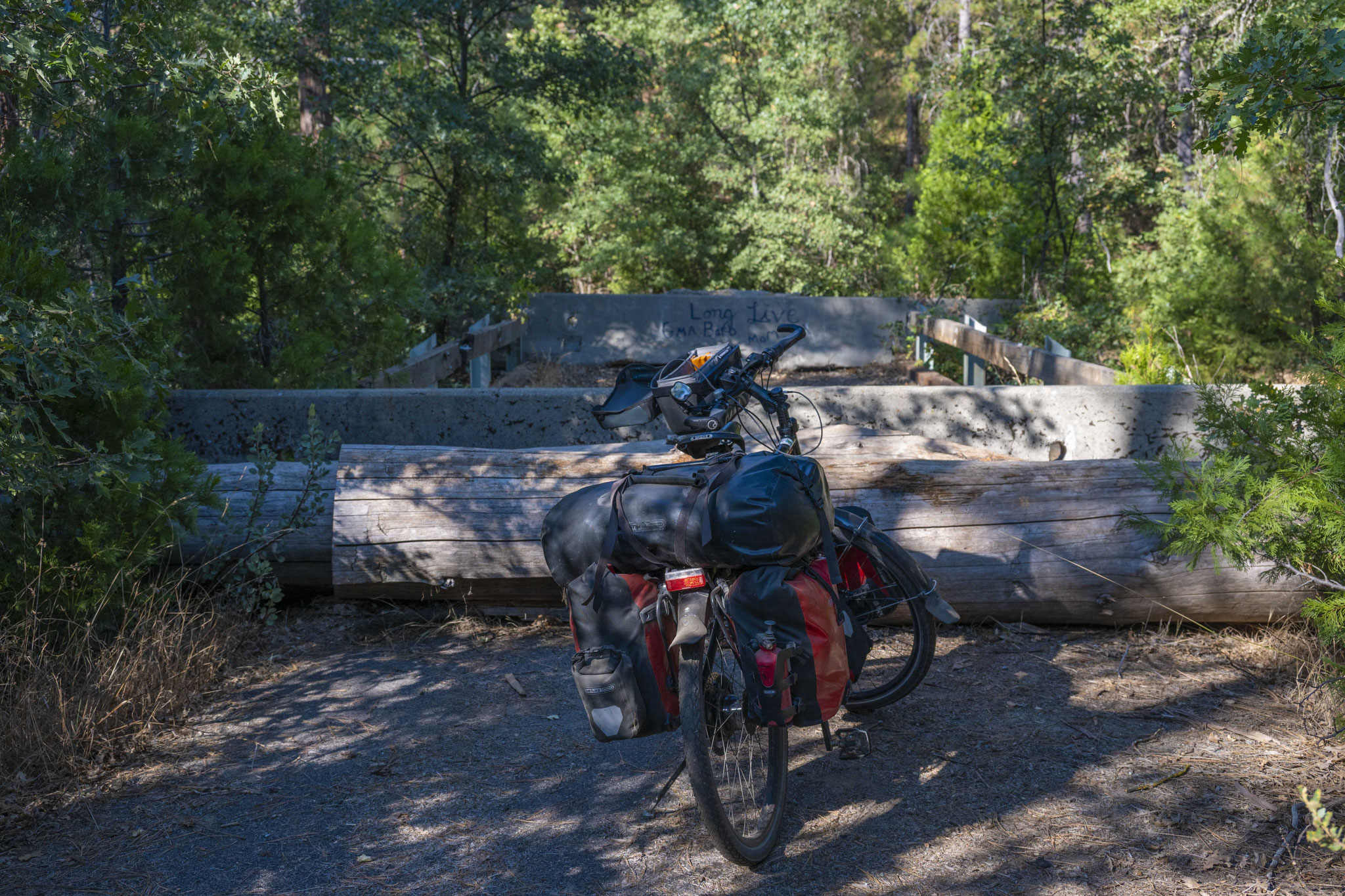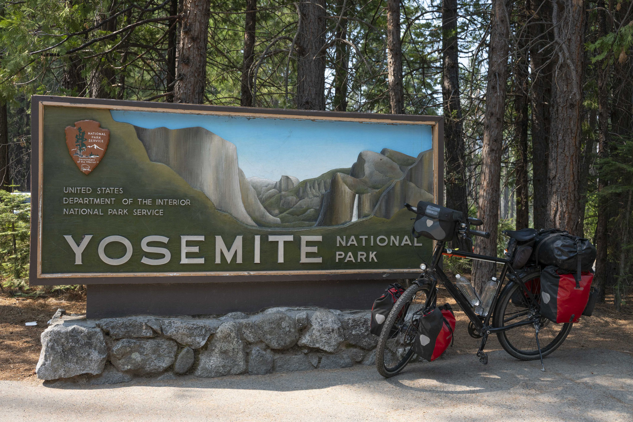 Am nächsten Morgen geht es nach einem kurzen Stopp in der ehemaligen Goldgräberstadt Coulterville, wo die Zeit stehengeblieben zu sein scheint, setze ich meinen Weg in Richtung Nationalpark fort und falle wieder einmal auf die Routenempfehlung von Komoot herein, statt der „offiziellen“ Wegweisung zu folgen. Ein Waldweg, der den Namen nicht verdient, Wege, die es nicht gibt und schließlich eine gesperrte Brücke als einzigem Ausweg aus diesem Irrgarten. Nach vielen sehr schweren Höhenmetern erreiche ich abends noch einen Campingplatz, wo ich den letzten freien Platz in der Nähe der Müllcontainer ergattere, was nicht weiter problematisch ist, wäre da nicht der große Schwarzbär, der immer wieder auf Futtersuche auf den Platz kommt und den Müllcontainer auch schon einmal umgeworfen und den Metalldeckel aufgebogen hat. Der Bär lässt sich nicht blicken, dafür macht allerdings eine Jugendgruppe bis weit nach Mitternacht Krawall.