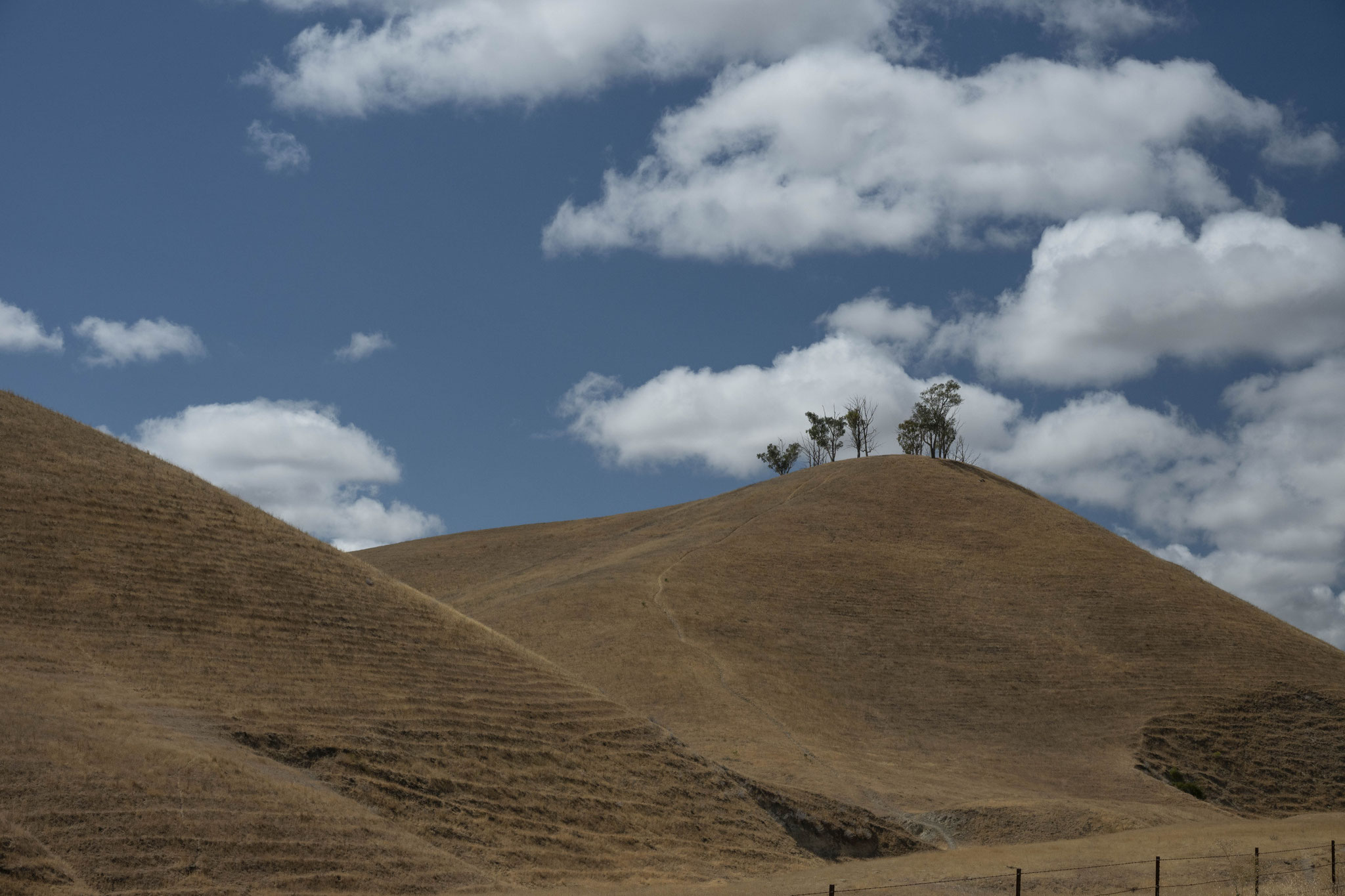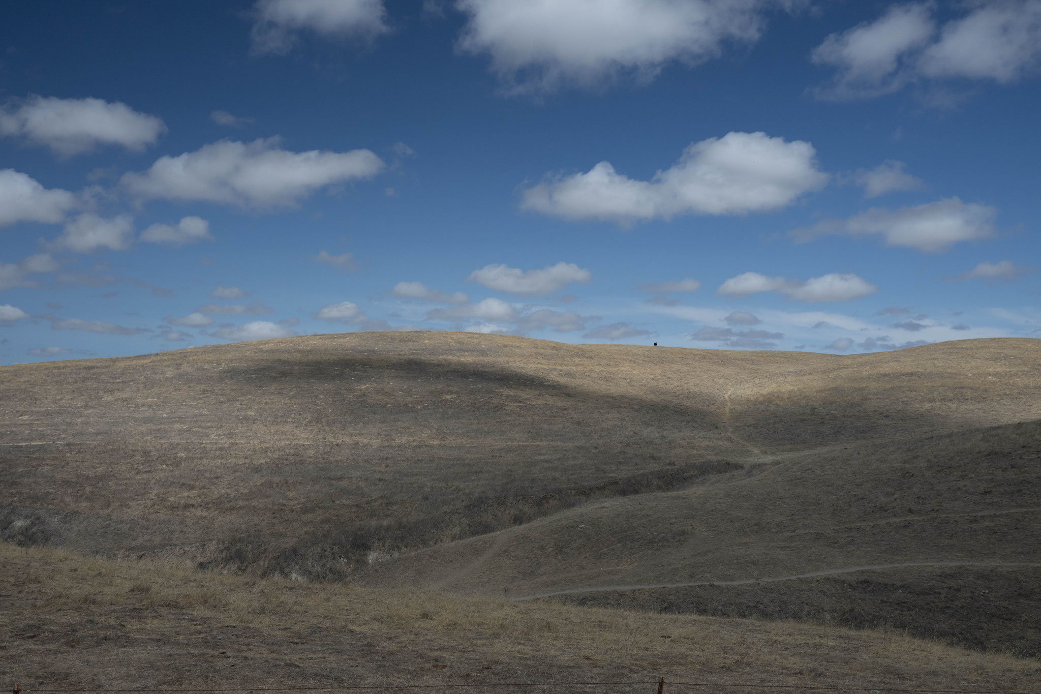 Eines gibt es allerdings nicht: Hotels, Campingplätze oder Orte, wo man sein Zelt hinter einem Busch aufschlagen könnte. Unkontrollierten Wildwuchs gibt es nicht. Alles ist im rechten Winkel angelegt, klinisch sauber (oder ökologisch tot) und selbst in einer Plantage wäre mein Zelt auf hunderte Meter zu sehen. In Caruthers habe ich das Glück, auf dem Kinderspielplatz einer Kirche (welcher Konfession auch immer, die Teilnahme am abendlichen Gottesdienst habe ich dankend abgelehnt) auf grünem Rasen (!) mit Wasserhahn und Stromanschluss mein Zelt aufstellen zu dürfen. Am nächsten Tag habe ich dieses Glück nicht und muss mein Zelt mangels Alternative ein paar Meter neben der Fahrbahn am Highway aufbauen, denn ich habe die Ebene verlassen, rundum sind nur Hügel mit verdorrtem Gras und alles ist mit Stacheldraht abgeriegelt.