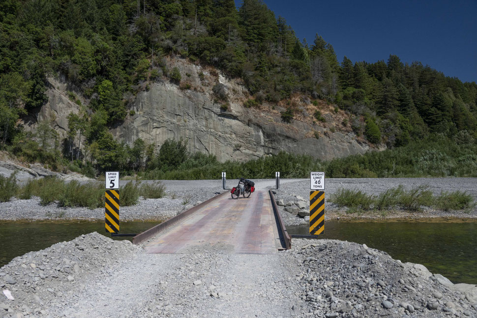 Seit Washington State folge ich weitgehend dem Highway 101, der sich an der gesamten Westküste der USA hinunterzieht. Hier in Kalifornien verlässt die Straße die Küste ein Stück ins Landesinnere und ist teilweise als Freeway ausgebaut, sodass ich ihn nicht überall befahren darf. Abseits der Küste wird es sehr schnell sehr heiß und zeitweise steigt die Temperatur am Lenker während der Fahrt auf über 42° (Celsius!). Hinzu kommt, dass es kaum Alternativen zum Highway gibt – außer Straßen, die man im Grunde nicht fahren möchte. 13 – 14% Steigung sind kein Spaß und anschließend auf Flusskiesel in einem fast ausgetrockneten Flussbett habe ich hier auch nicht erwartet. Immerhin gibt es eine Behelfsbrücke, sodass ich nicht durch den Fluss muss, um wieder auf eine befestigte Straße zu kommen – und ich habe mich nicht verfahren!