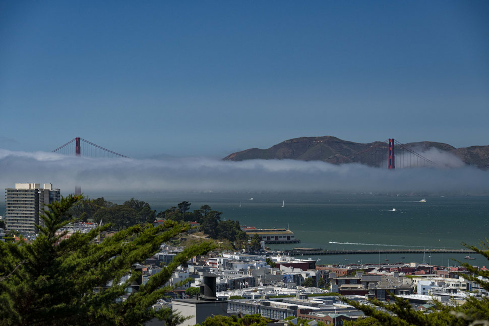 Ein Besuch des Coit Tower auf dem Telegraph Hill, von dem man eine schönen Rundumblick auf die Stadt hat, der Dank eines ausgefallenen Fahrstuhls auch nicht so voll ist (220 Stufen sind vielen viel zu viel), macht noch einmal klar, welches Glück ich bei der Fahrt über die Golden Gate Bridge hatte – sie ist heute in einer Nebelbank verpackt.
