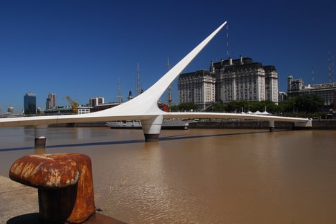 Ein neues Wahrzeichen für die Stadt, die Drehbrücke Puente de la Mujer im Puerto Madero, denn die alten Hafenbecken, um die herum neue Geschäfts- und Wohnhäuser entstanden sind, werden heute als extravagante Yachthäfen genutzt.