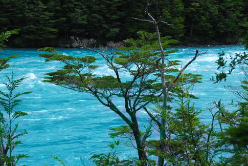 Dafür entschädigt die Landschaft. Schnee bedeckte Berge, Gletscher, weite Täler mit mäandrierenden breiten Gletscherflüssen wechseln sich ständig ab und bald folgen wir dem Ufer des Lago General Carrera, des zweitgrößten Sees Suedamerikas, der auf der argentinischen Seite Lago Buenos Aires heißt. Spektakulaär ist sein türkisfarbes Wasser. Die Ursache für die Farbe sind die vielen Gletscherflüsse, die ihn speisen.