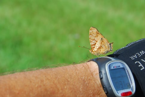 Fahrrad fahren ist bei diesen Temperaturen eine Schweiß treibende Geschichte - und das wissen auch die Schmetterlinge, die mich bei einer Pause besetzen, um sich mit Mineralien zu versorgen